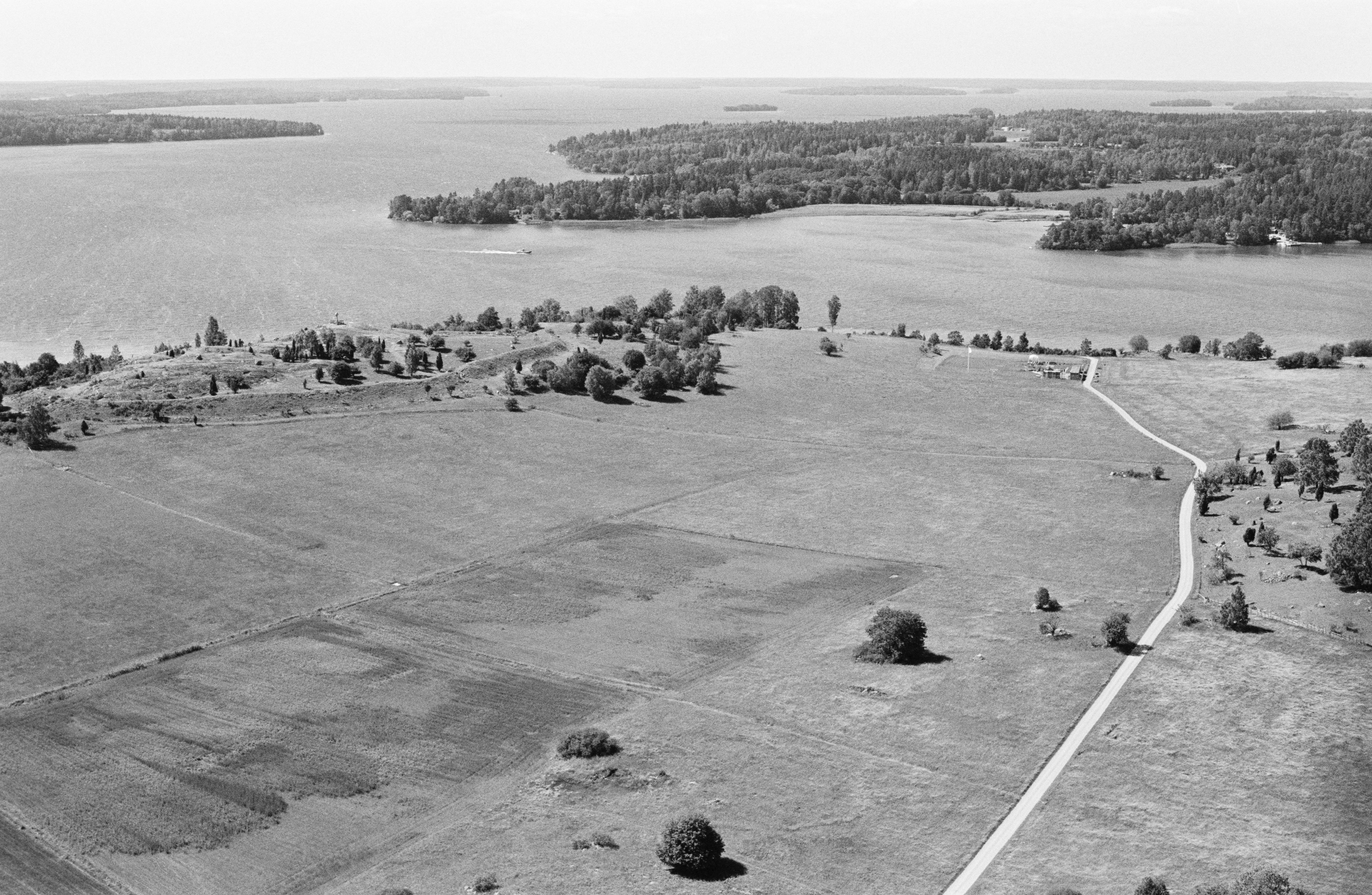 Beskrivning: Fornlämningsområdet Birka på Björkö i Mälaren. Till höger om bildens mitt arkeologisk undersökning i norra delen av ön i området Hemlanden och Svarta jorden RAÄnr Adelsö 118:1 vid Stadsvallen Adelsö 119:1-2. Adelsön uppe till höger. Bilden är tagen mot (väderstreck): VNV