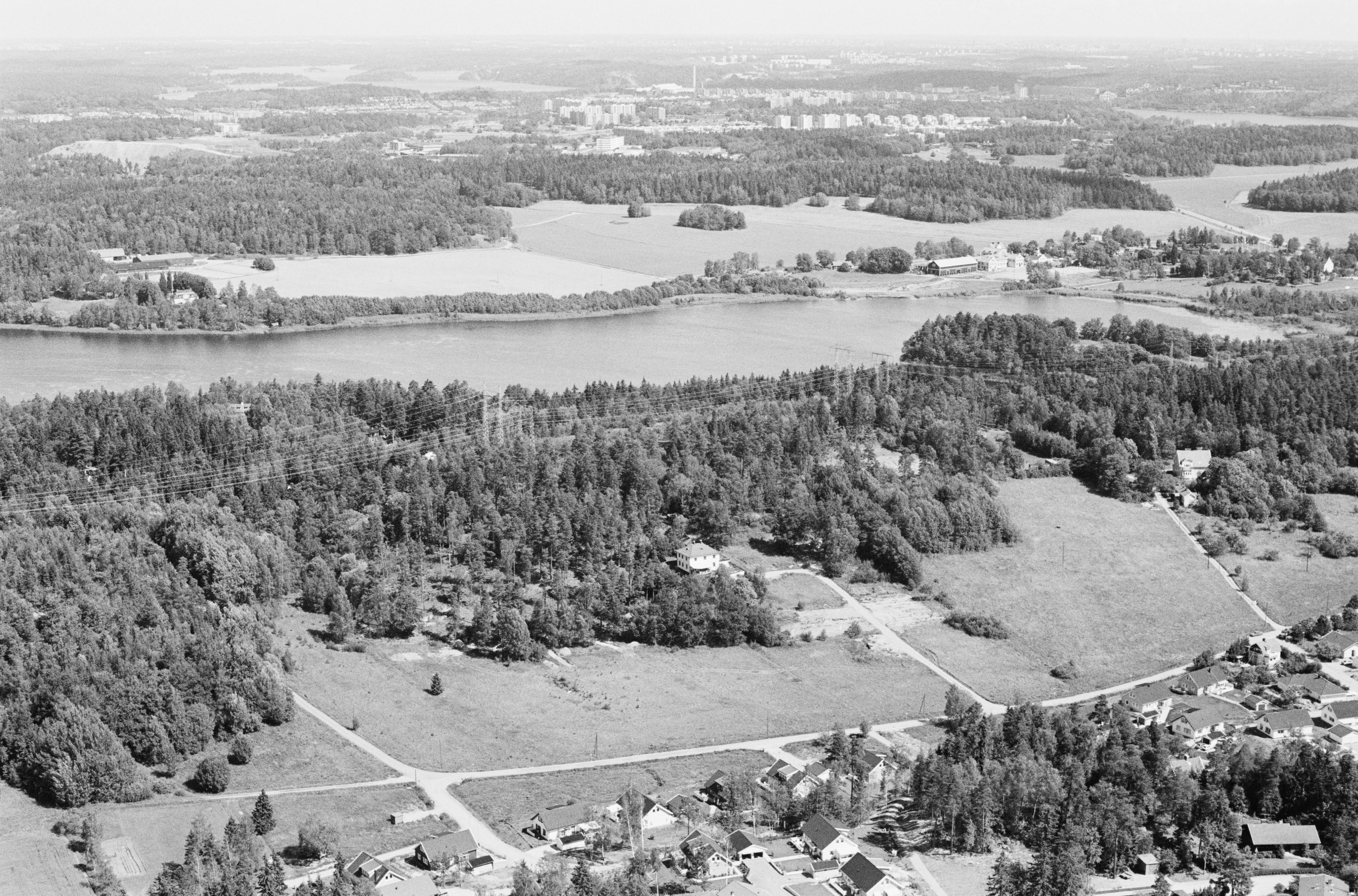 Beskrivning: Under bildens mitt arkeologisk undersökning av boplats RAÄnr Botkyrka 371:1 i norra delen av området Vretarna vid sjön Aspen. I bildens övre del Hågelby herrgård (skrivs även Hågelby gård / Hågelby slott). Bilden är tagen mot (väderstreck): NNV