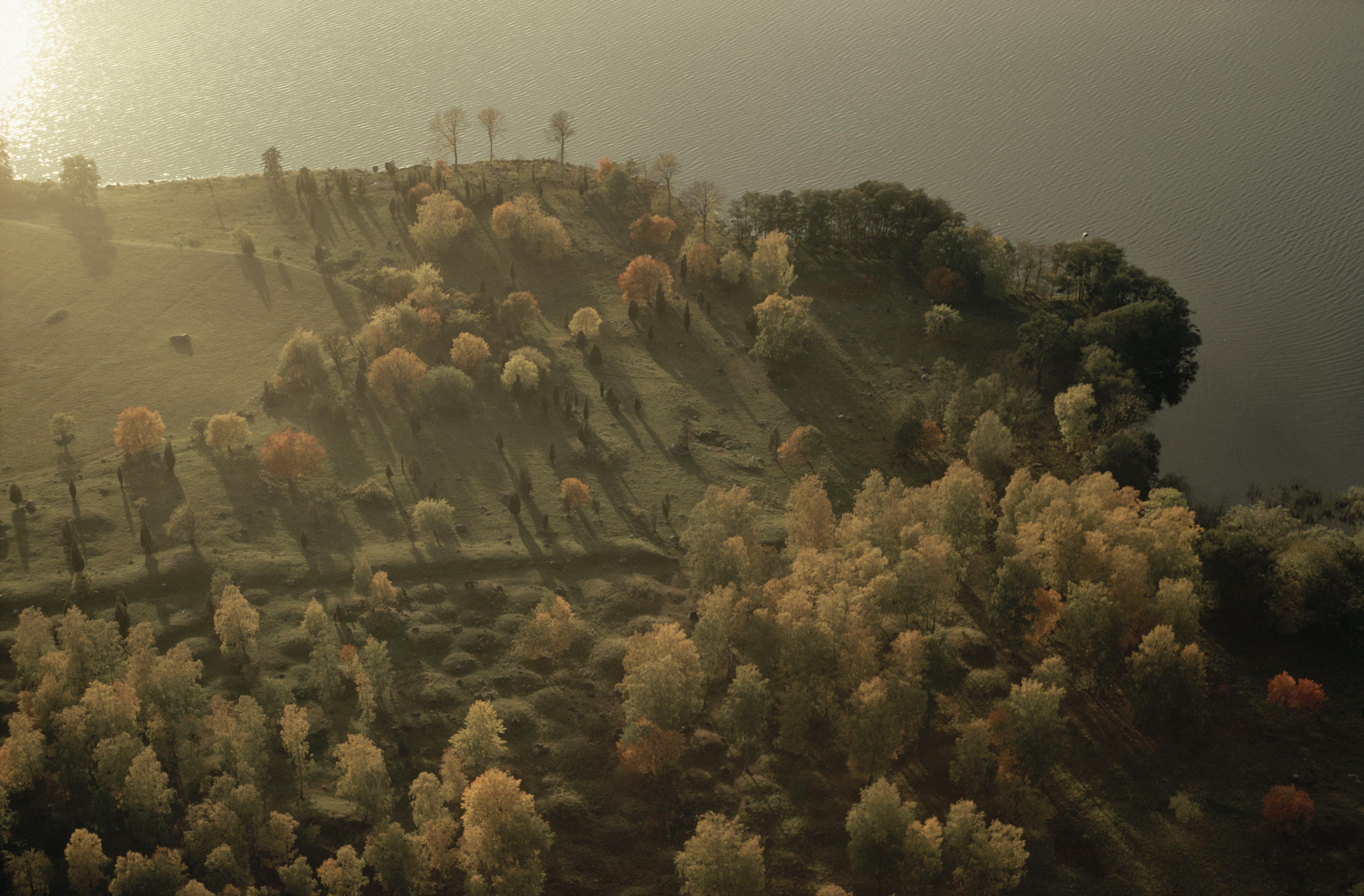 Beskrivning: Fornlämningsområdet Birka på Björkö i Mälaren. Norra delen av ön i området Hemlanden och Svarta jorden RAÄnr Adelsö 118:1 vid Stadsvallen Adelsö 119:1-2 vid Kugghamn. Bilden är tagen mot (väderstreck): V