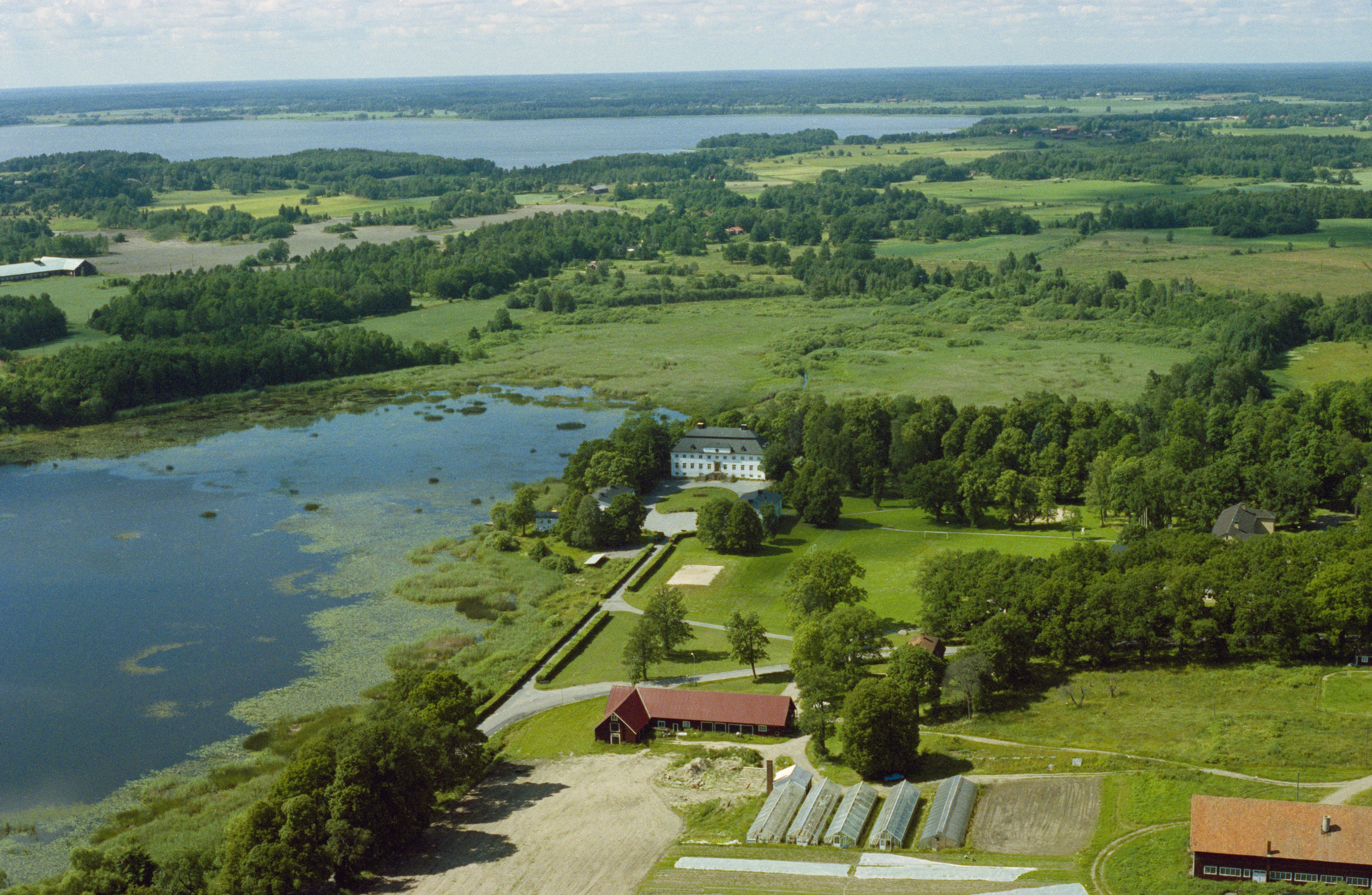 Beskrivning: Ekebyholms slott vid sjön Syningen. Vid slottet sädesmagasin RAÄnr Rimbo 248:1-2. Bilden är tagen mot (väderstreck): V