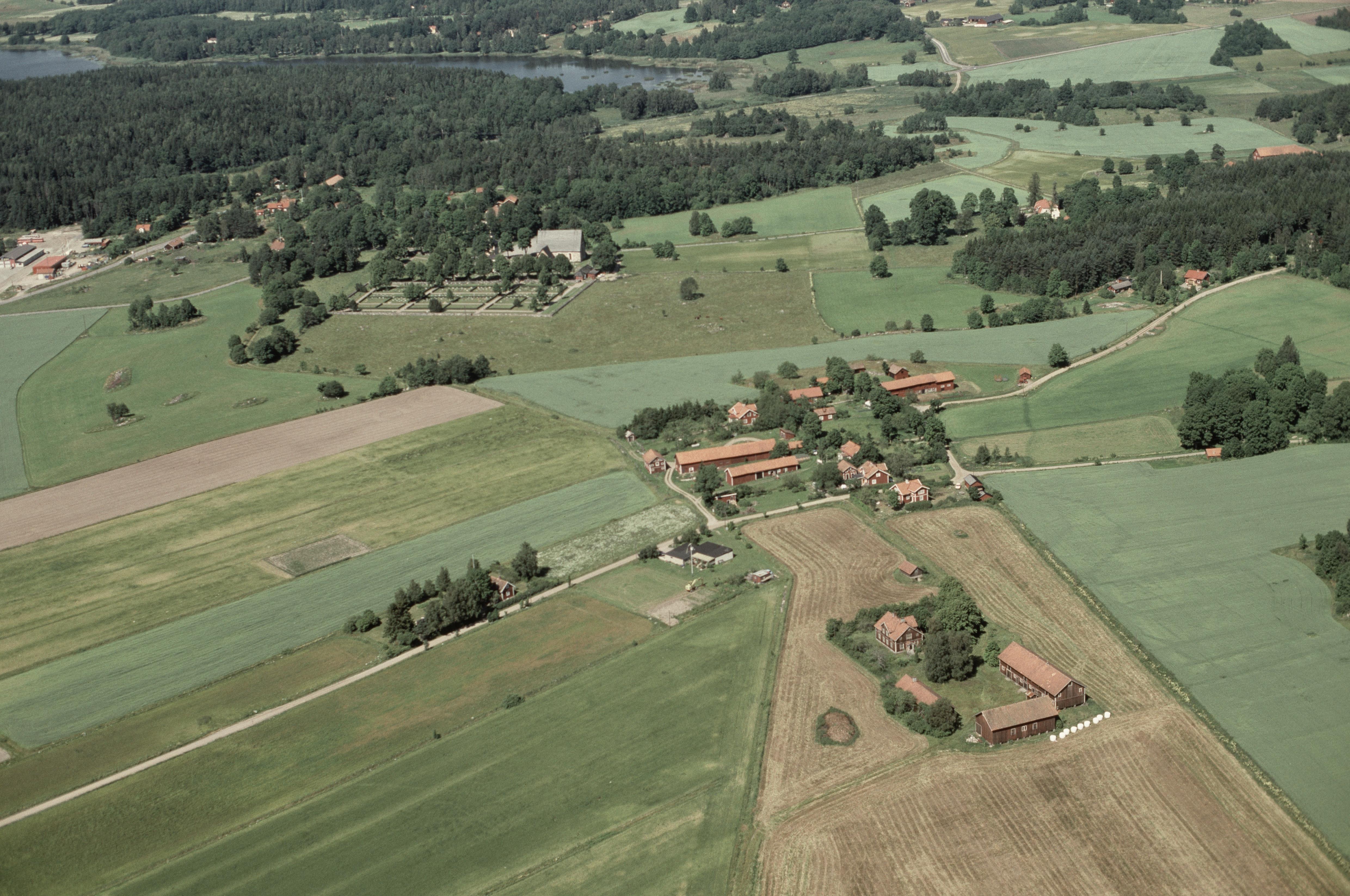 Beskrivning: Liesta by. Över bildens mitt Rimbo kyrka och kyrkby. Uppe till vänster sjön Syningen. Bilden är tagen mot (väderstreck): N
