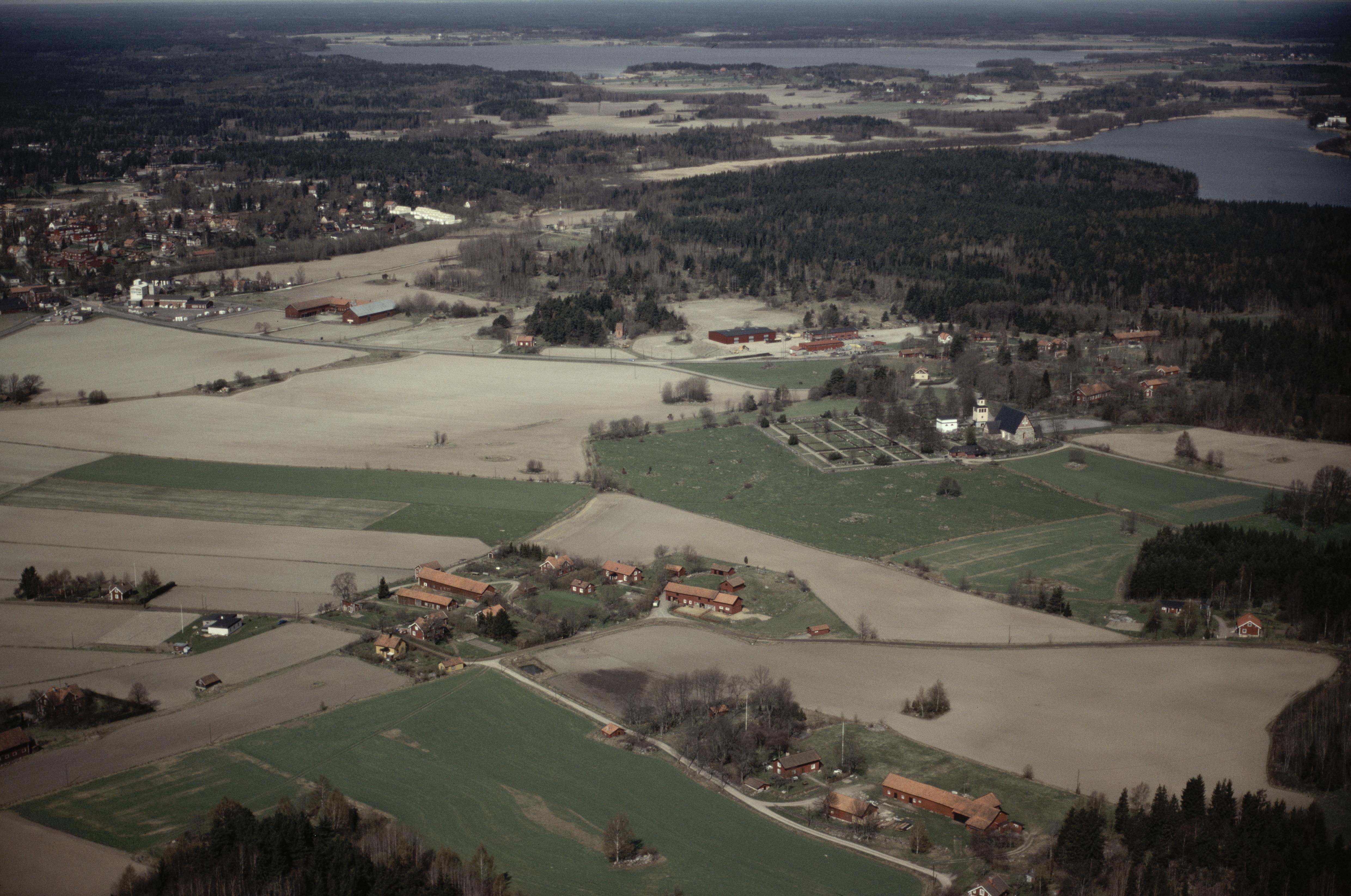 Beskrivning: Liesta by i bildens nedre del. Till höger Rimbo kyrka. I bildens övre del sjön Syningen. Bilden är tagen mot (väderstreck): VNV