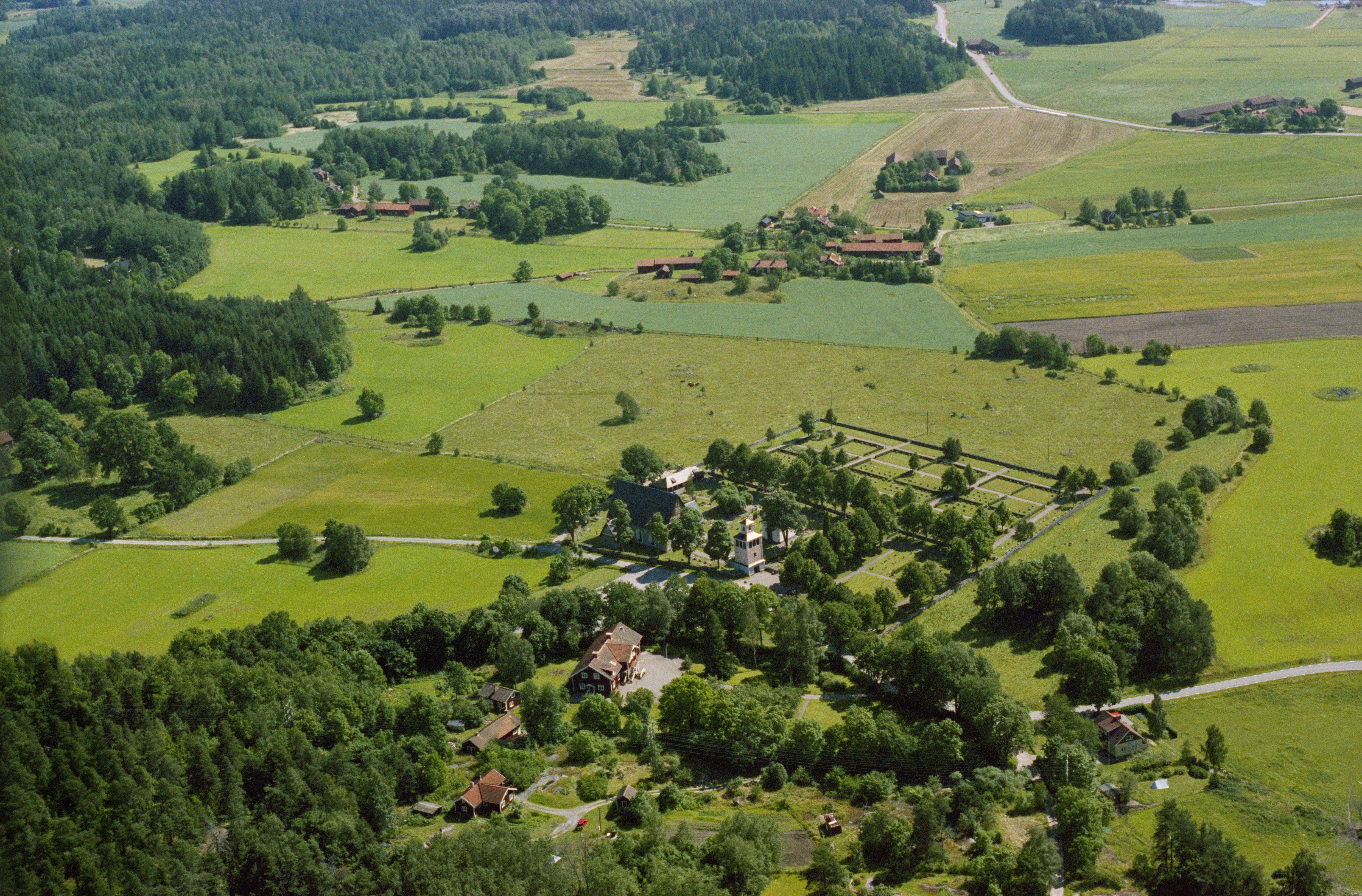 Beskrivning: Rimbo kyrka och kyrkby vid bildens mitt. Liesta by i bildens ävre del. Bilden är tagen mot (väderstreck): SO