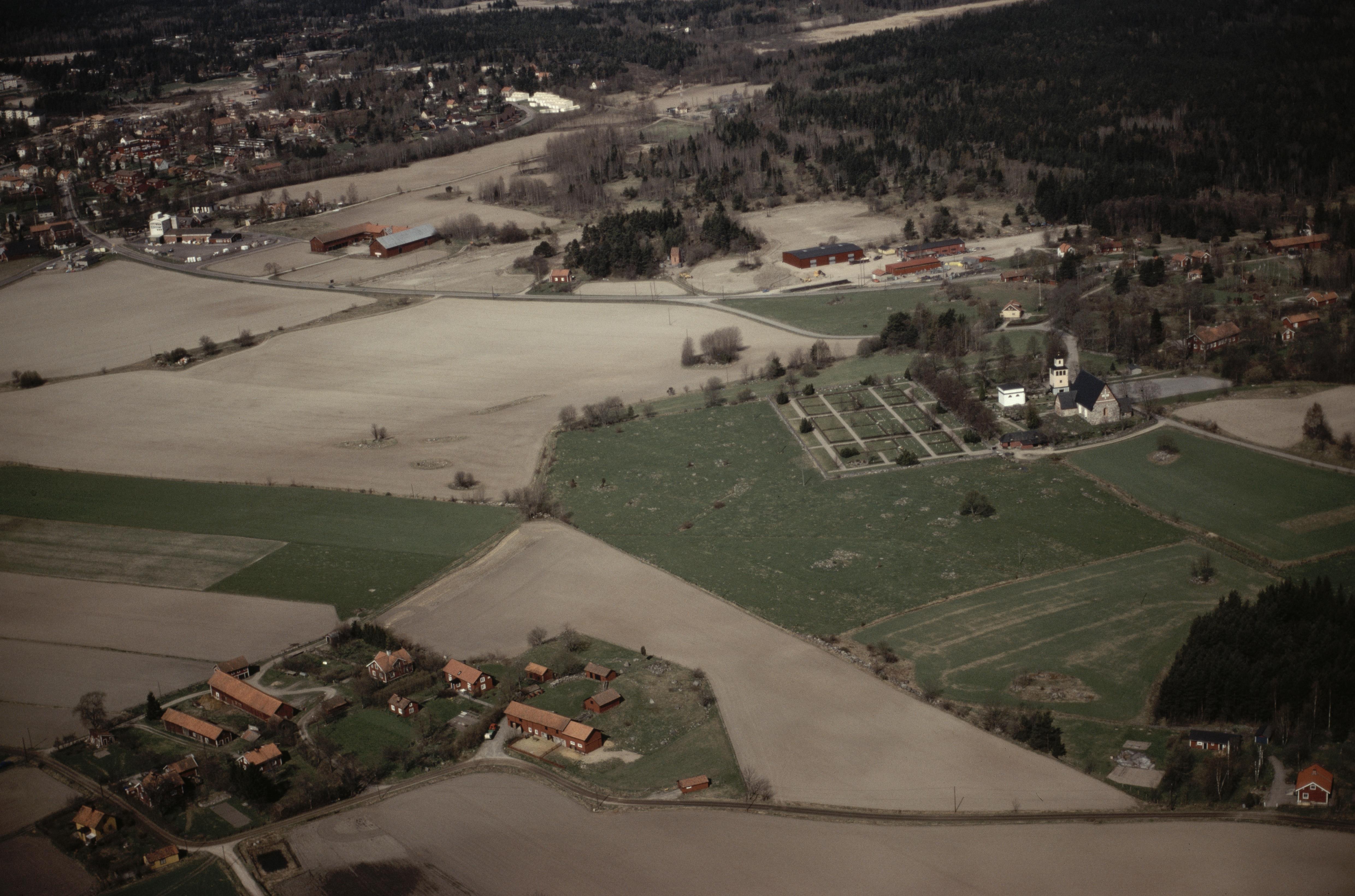 Beskrivning: Uppe till vänster Rimbo tätort och nere till vänster Liesta by. Till höger om bildens mitt Rimbo kyrka och kyrkby. Bilden är tagen mot (väderstreck): NV