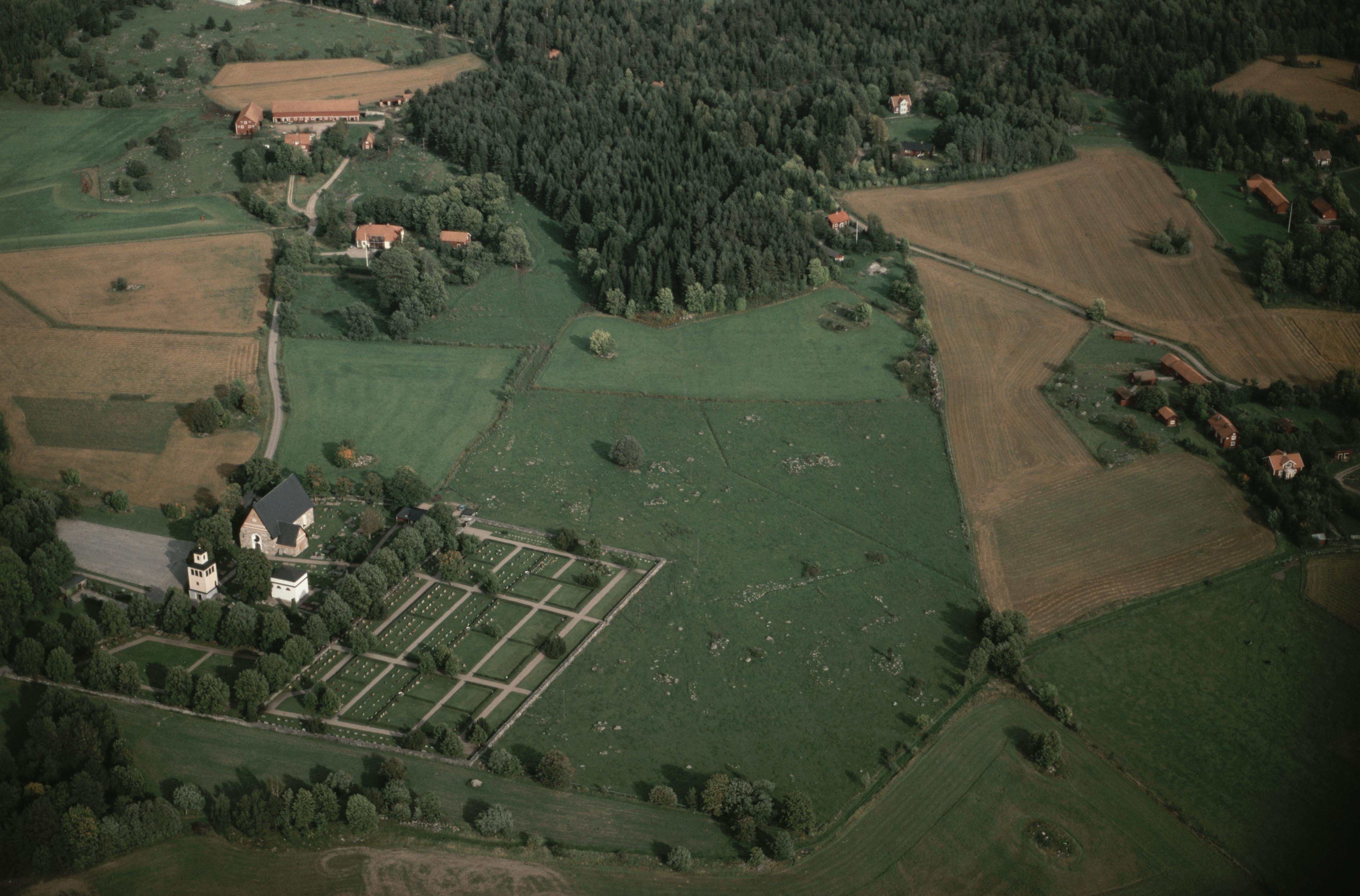 Beskrivning: Till vänster Rimbo kyrka och kyrkby. Till höger Liesta by. Bilden är tagen mot (väderstreck): NO