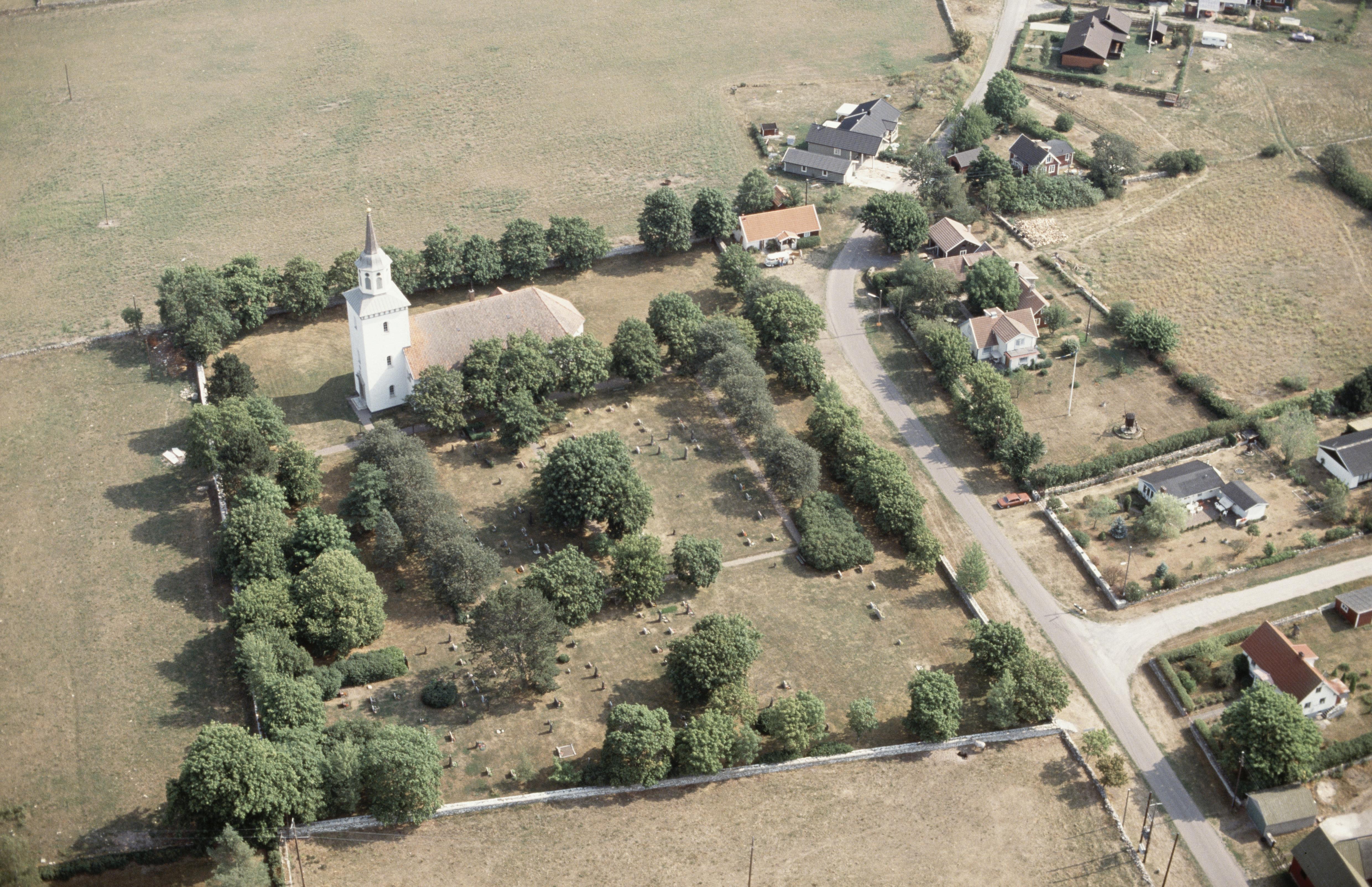 Beskrivning: Alvaret. Sandby kyrka och kyrkby. Bilden är tagen mot (väderstreck): NO