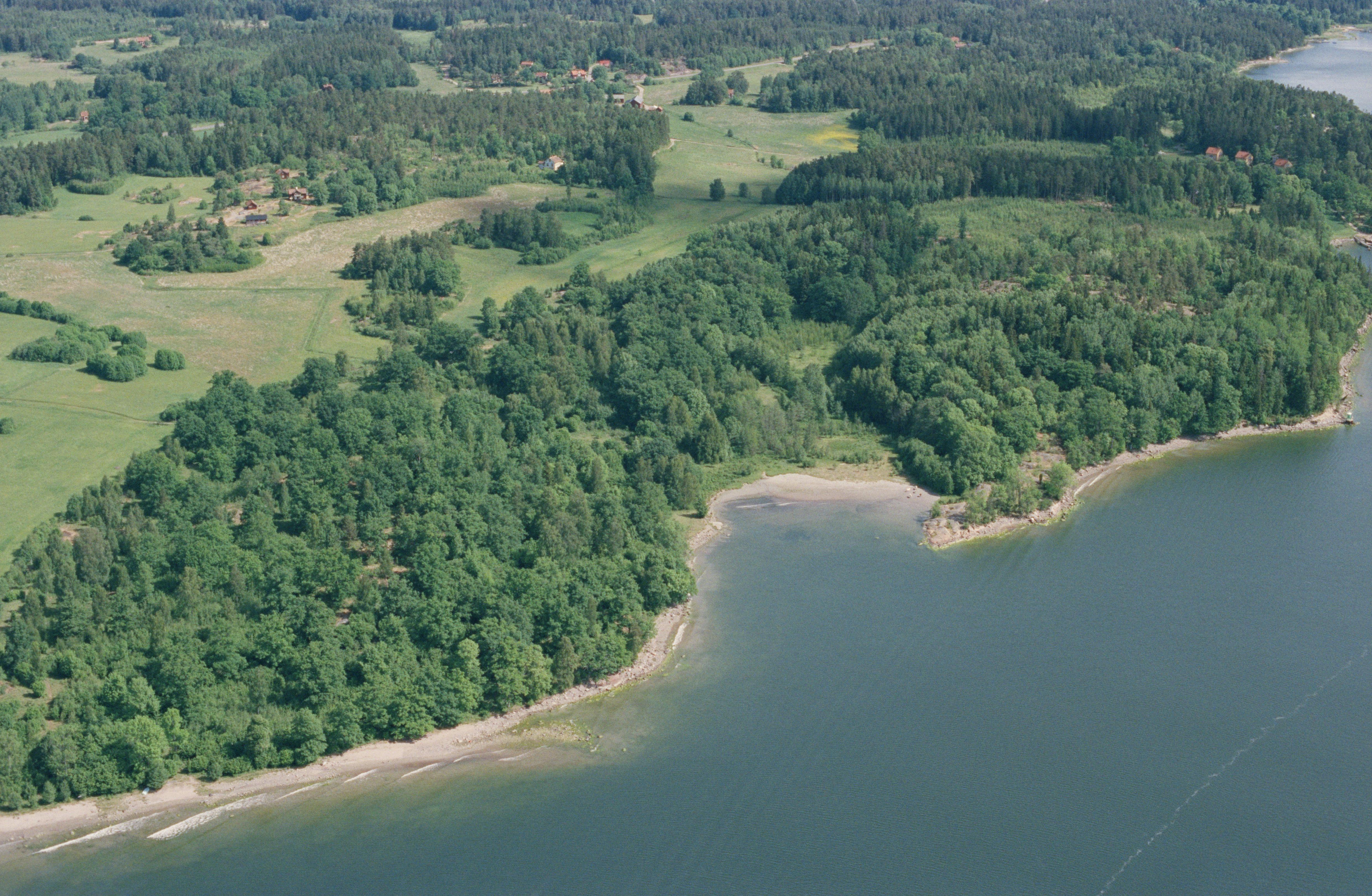 Beskrivning: Nere till vänster Munktorp med runsten RAÄnr Roslags-Kulla 3:1. Uppe till höger vårdkase Kasen RAÄnr Roslags-Kulla 42:1 på Staboudd / Stavberget. Bilden är tagen mot (väderstreck): N
