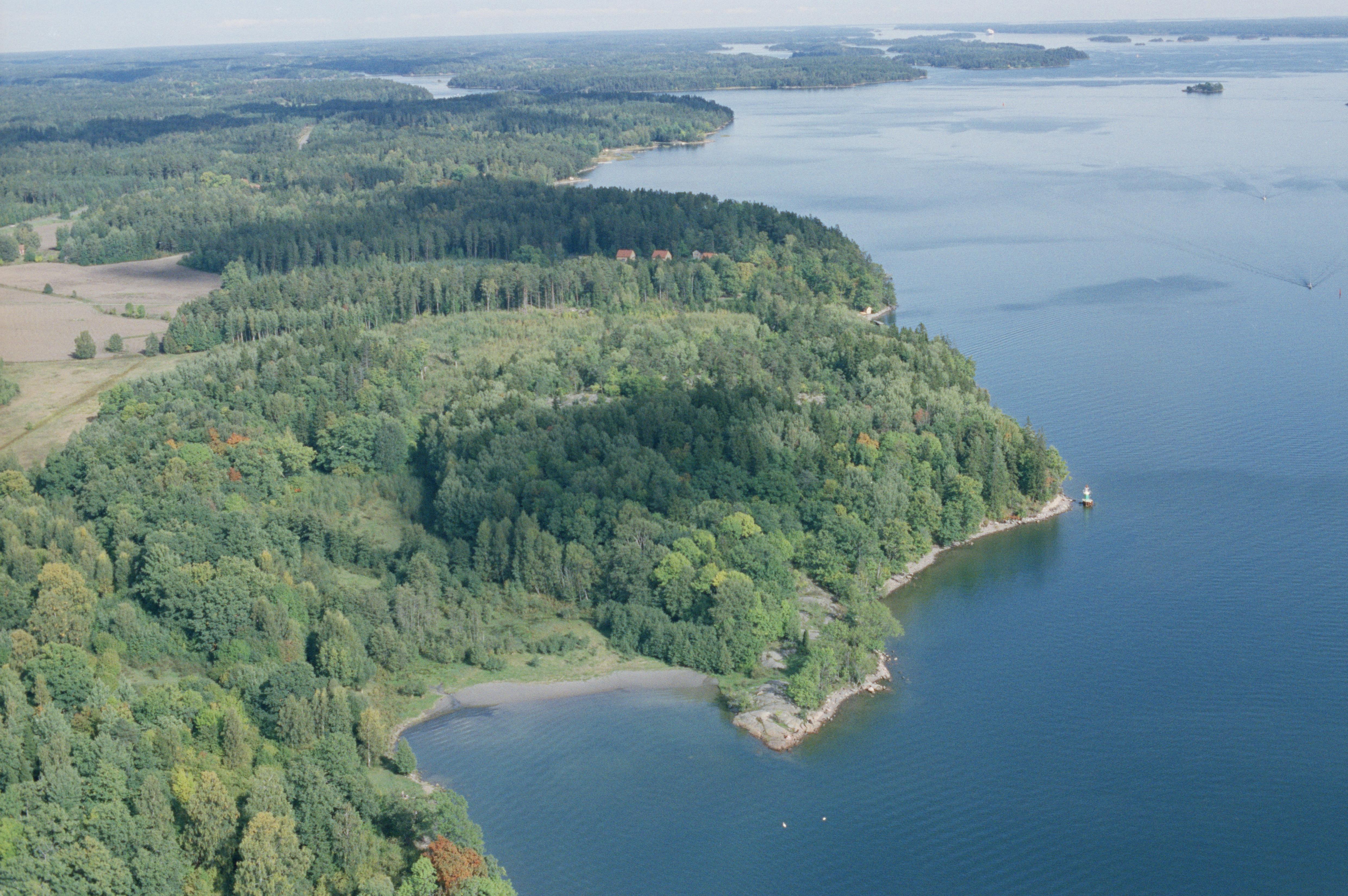 Beskrivning: Vid bildens mitt vårdkase Kasen RAÄnr Roslags-Kulla 42:1 på Staboudd / Stavberget. Bilden är tagen mot (väderstreck): NO