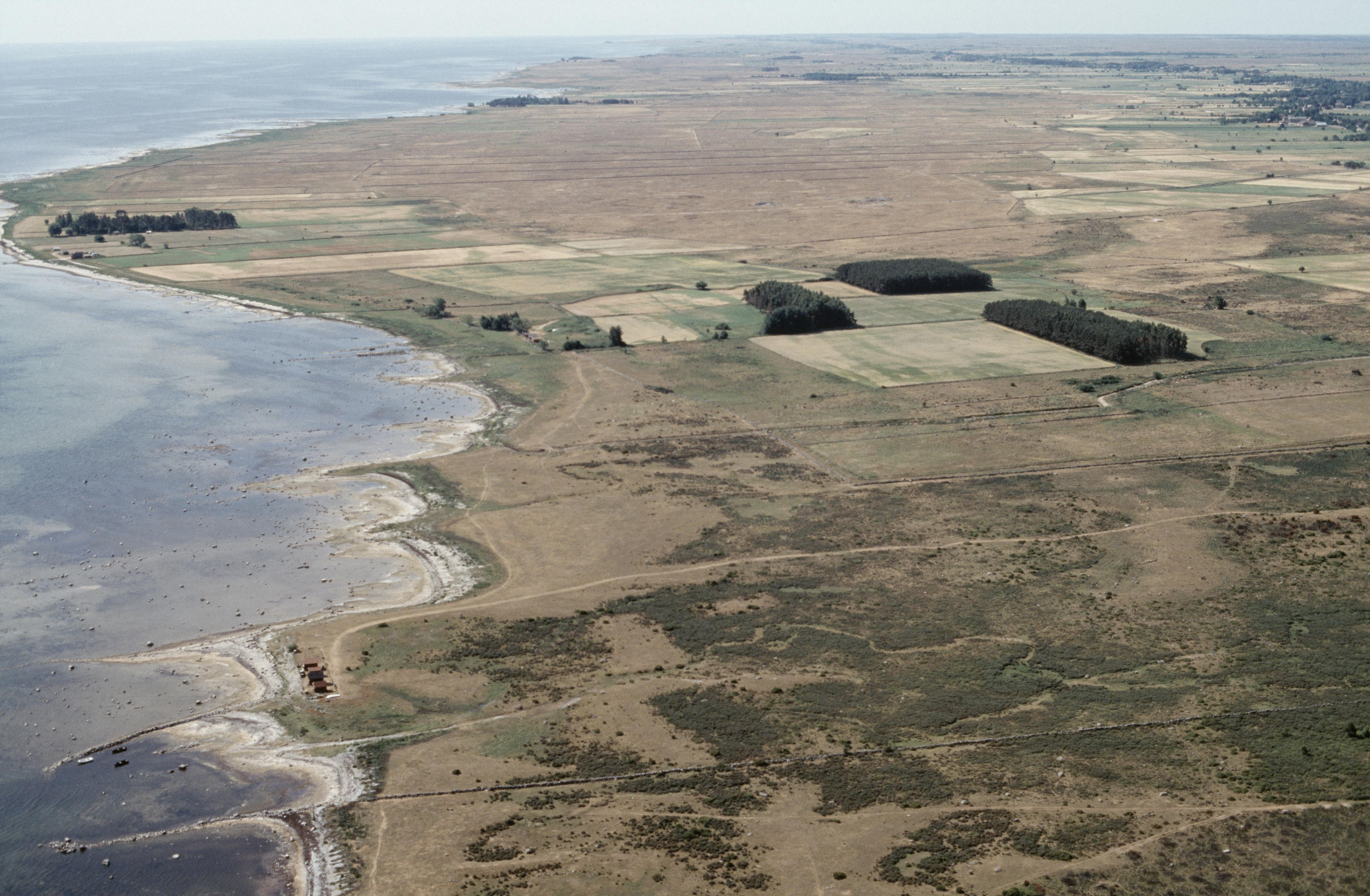 Beskrivning: Strandängar på öster om Stora Brunneby. Till höger om bildens mitt området vid stensättning RAÄnr Stenåsa 61:2 och hällristning Stenåsa 128:1. Bilden är tagen mot (väderstreck): SV