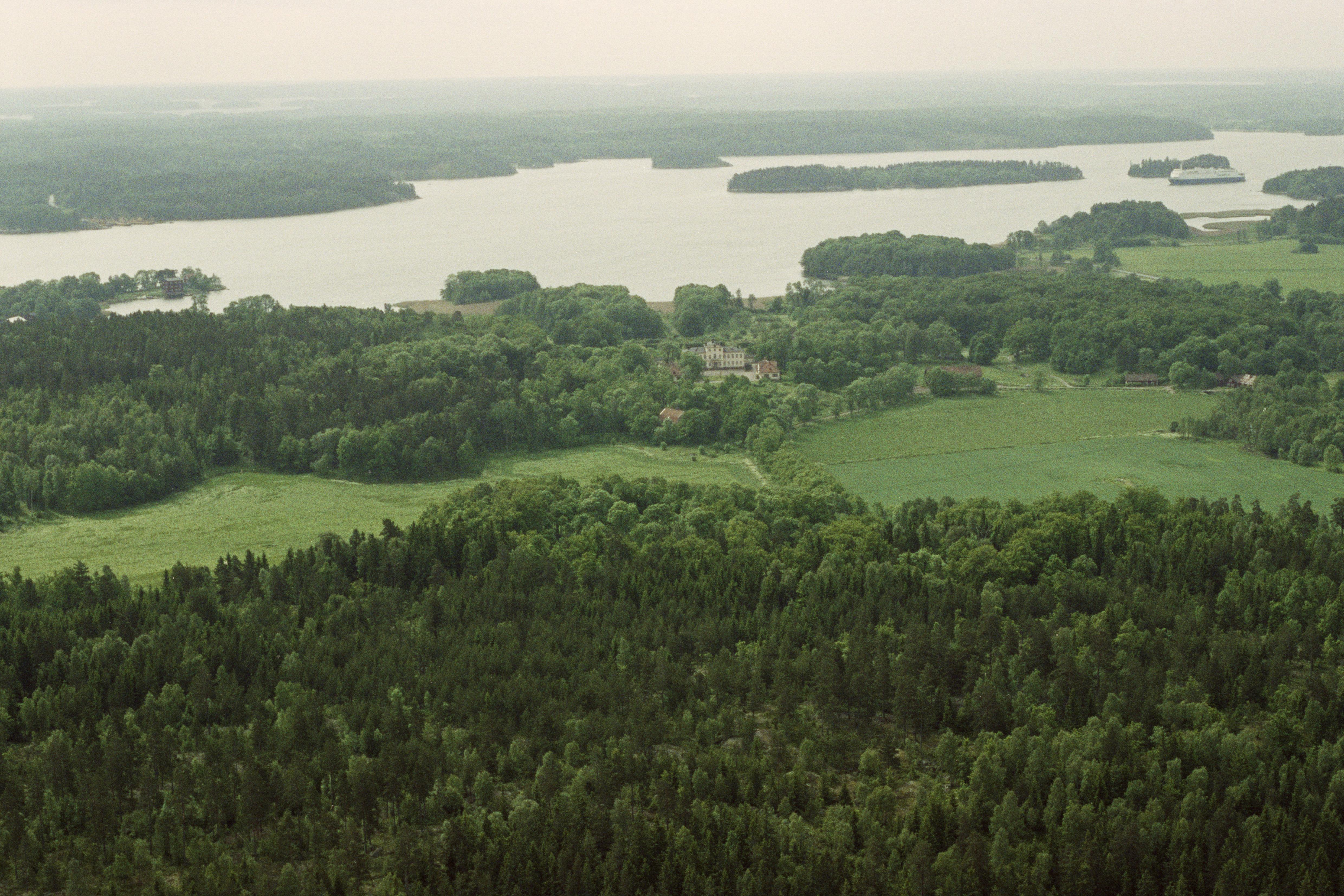 Beskrivning: Östanå slott vid Loån. Till vänster gravfält RAÄnr Roslags-Kulla 21:1 mot Ennäsudden. I bildens övre del Roslagens skärgård mot Ljusterö socken. Bilden är tagen mot (väderstreck): SSO