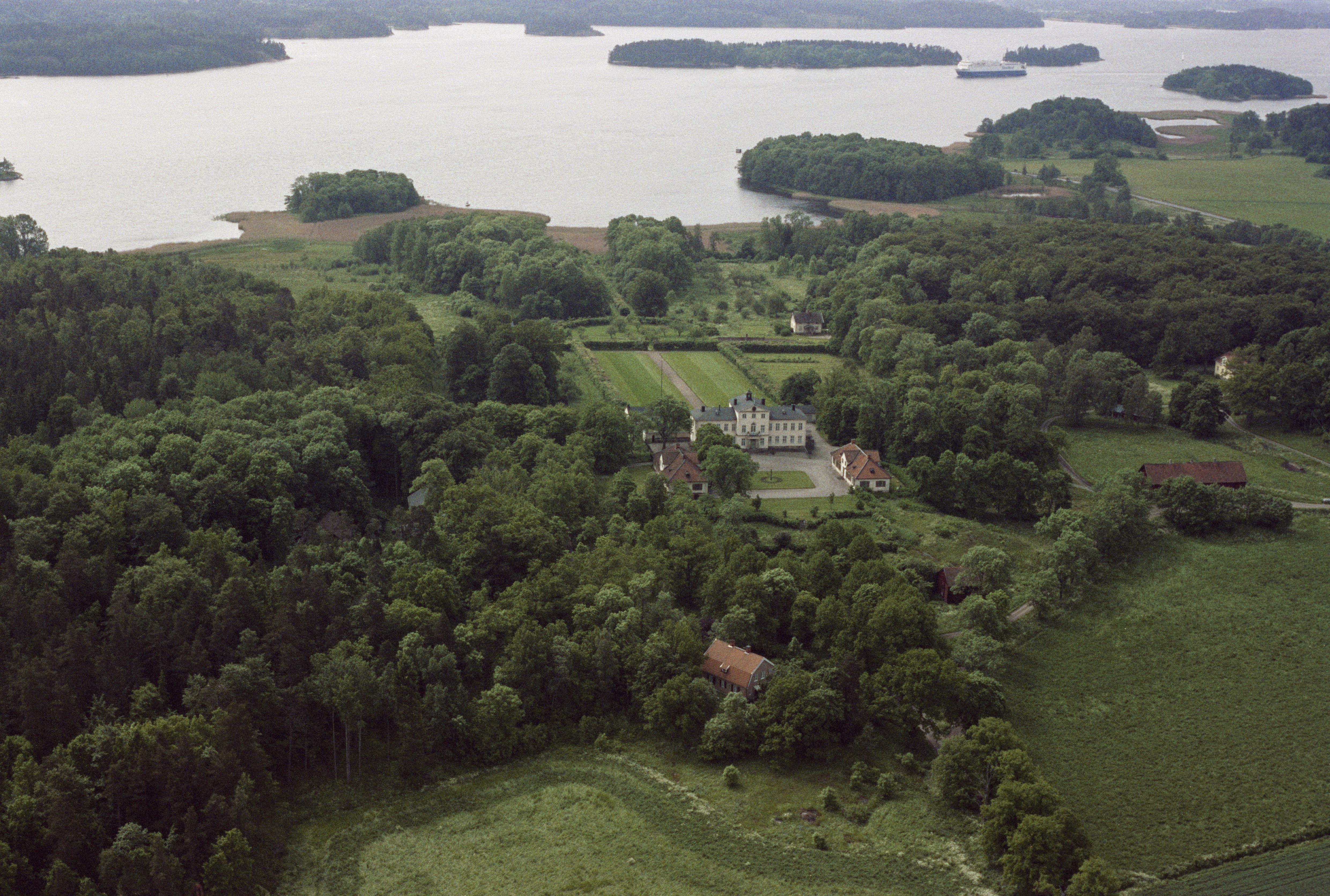 Beskrivning: Östanå slott vid Loån. Nere till vänster gravfält RAÄnr Roslags-Kulla 21:1. I bildens övre del Roslagens skärgård mot Ljusterö socken. Bilden är tagen mot (väderstreck): S