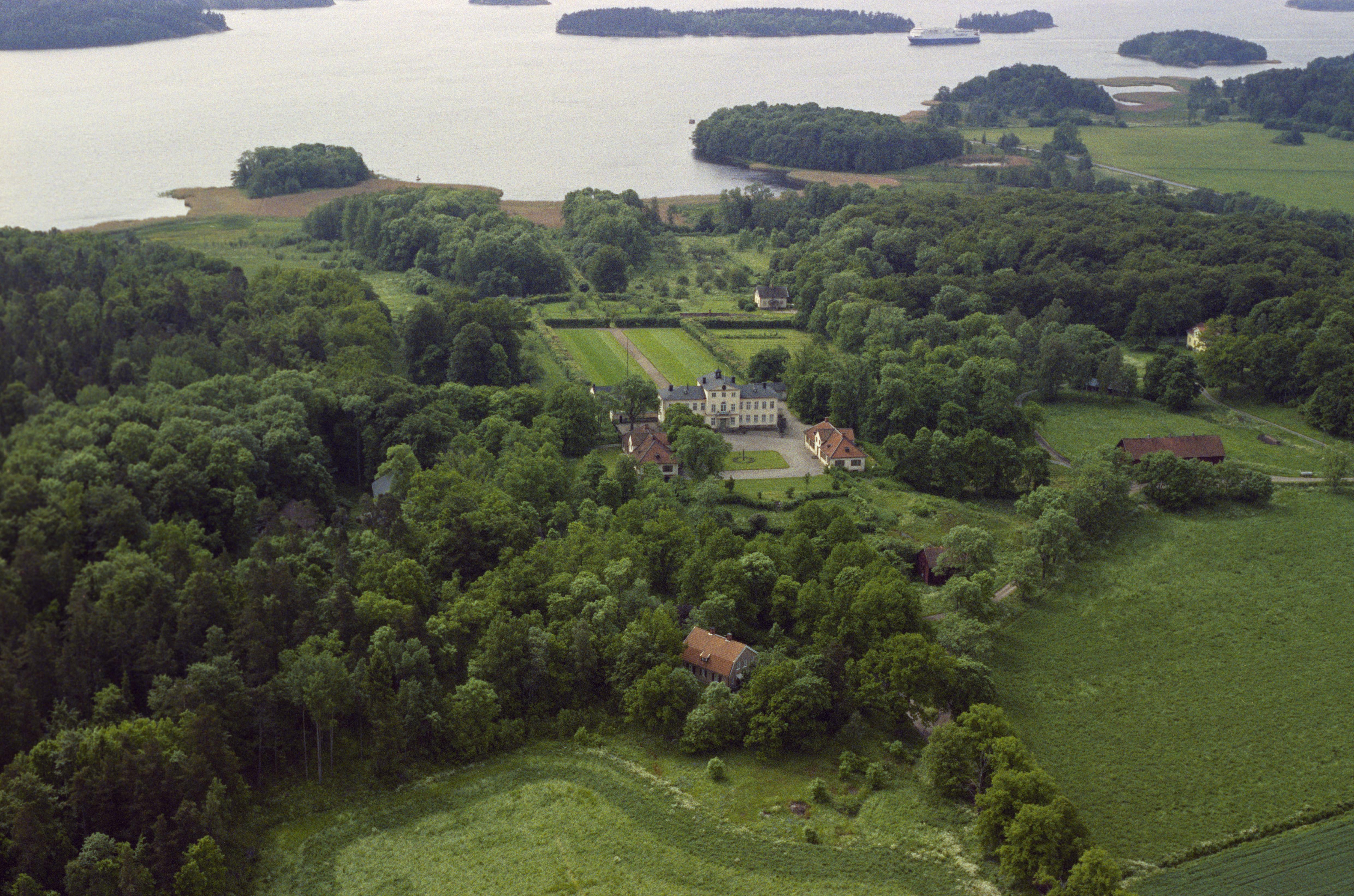 Beskrivning: Östanå slott vid Loån. Nere till vänster gravfält RAÄnr Roslags-Kulla 21:1. I bildens övre del Roslagens skärgård mot Ljusterö socken. Bilden är tagen mot (väderstreck): S