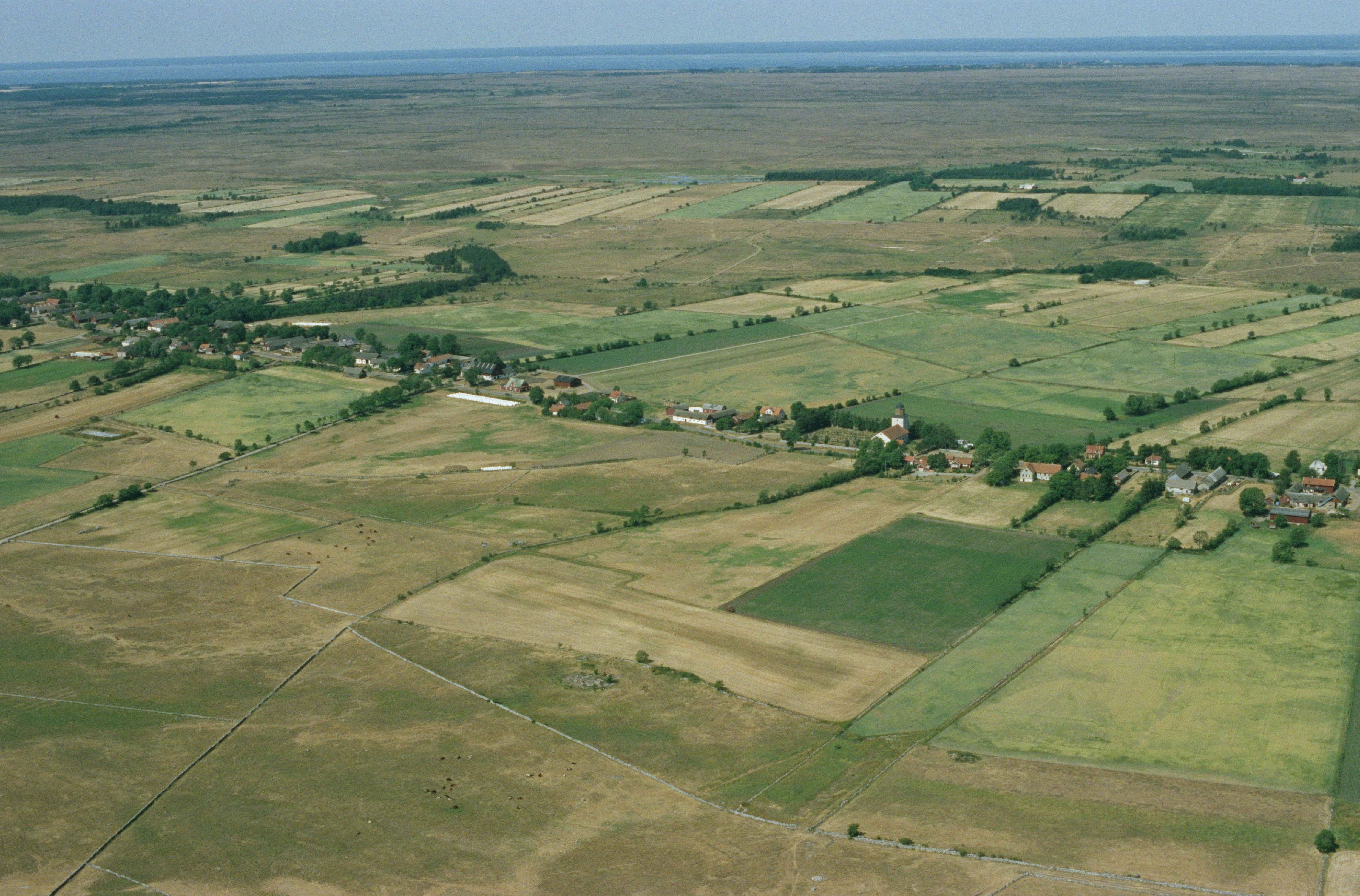 Beskrivning: Alvaret. Stenåsa kyrka och kyrkby i bildens till höger. Till vänster Slagerstad. Bilden är tagen mot (väderstreck): SV