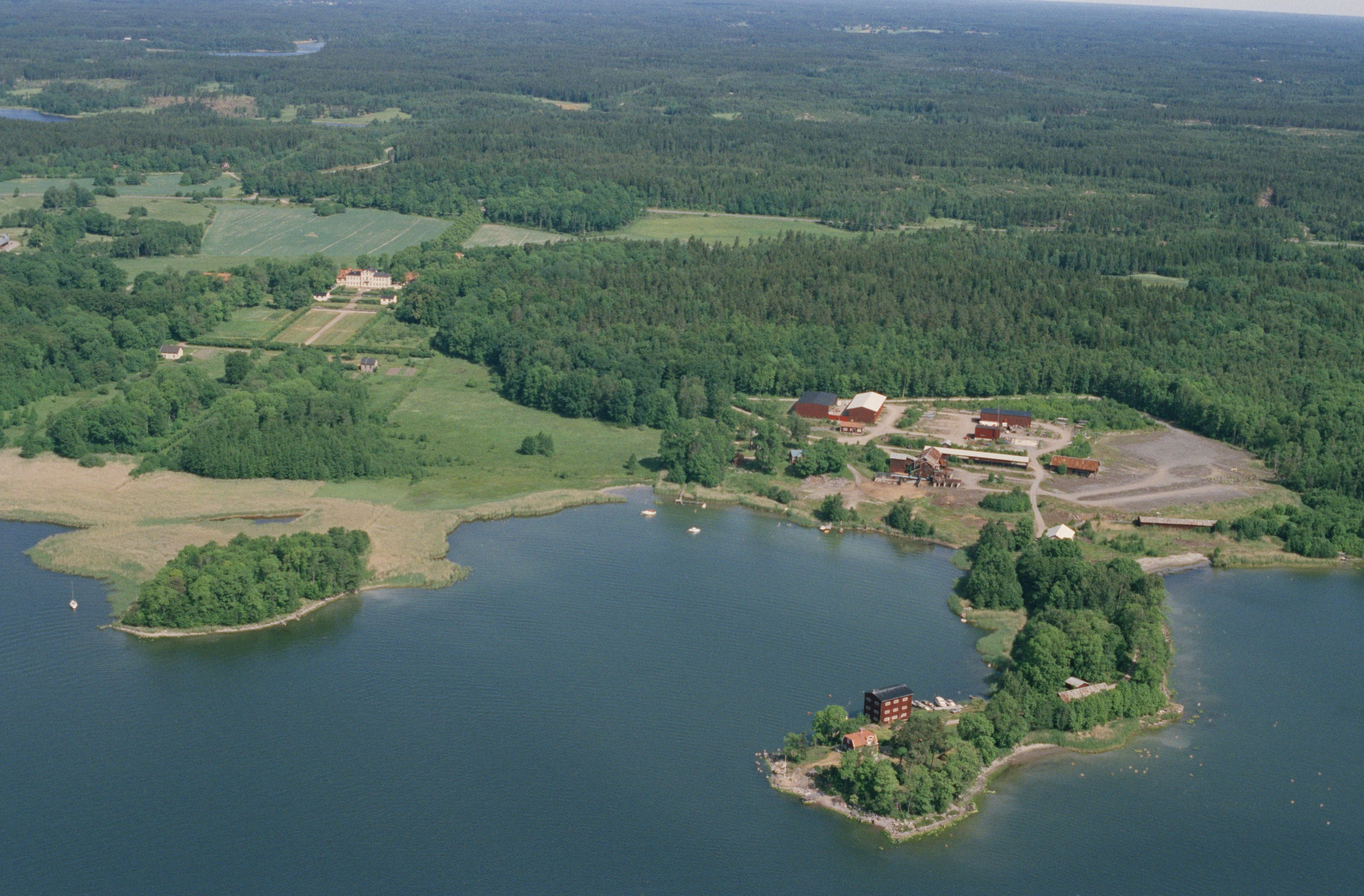 Beskrivning: Uppe till vänster Östanå slott. Nere till höger Ennäsudden med hamnanläggning RAÄnr Roslags-Kulla 59:1-3. Bilden är tagen mot (väderstreck): NV