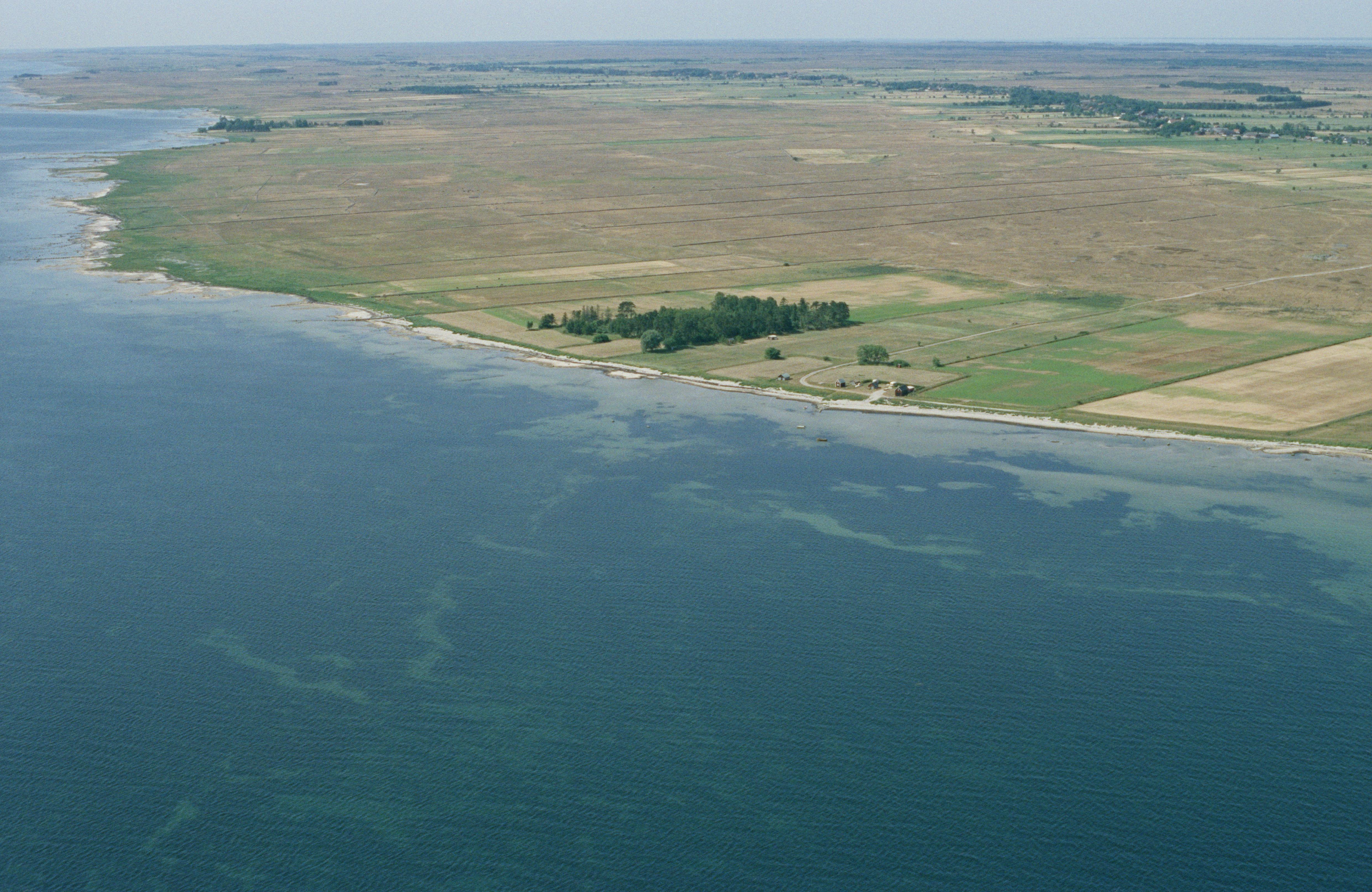Beskrivning: Strandängar på öster om Stora Brunneby. Till höger om bildens mitt området vid stensättning RAÄnr Stenåsa 61:2 och hällristning Stenåsa 128:1. Bilden är tagen mot (väderstreck): SV
