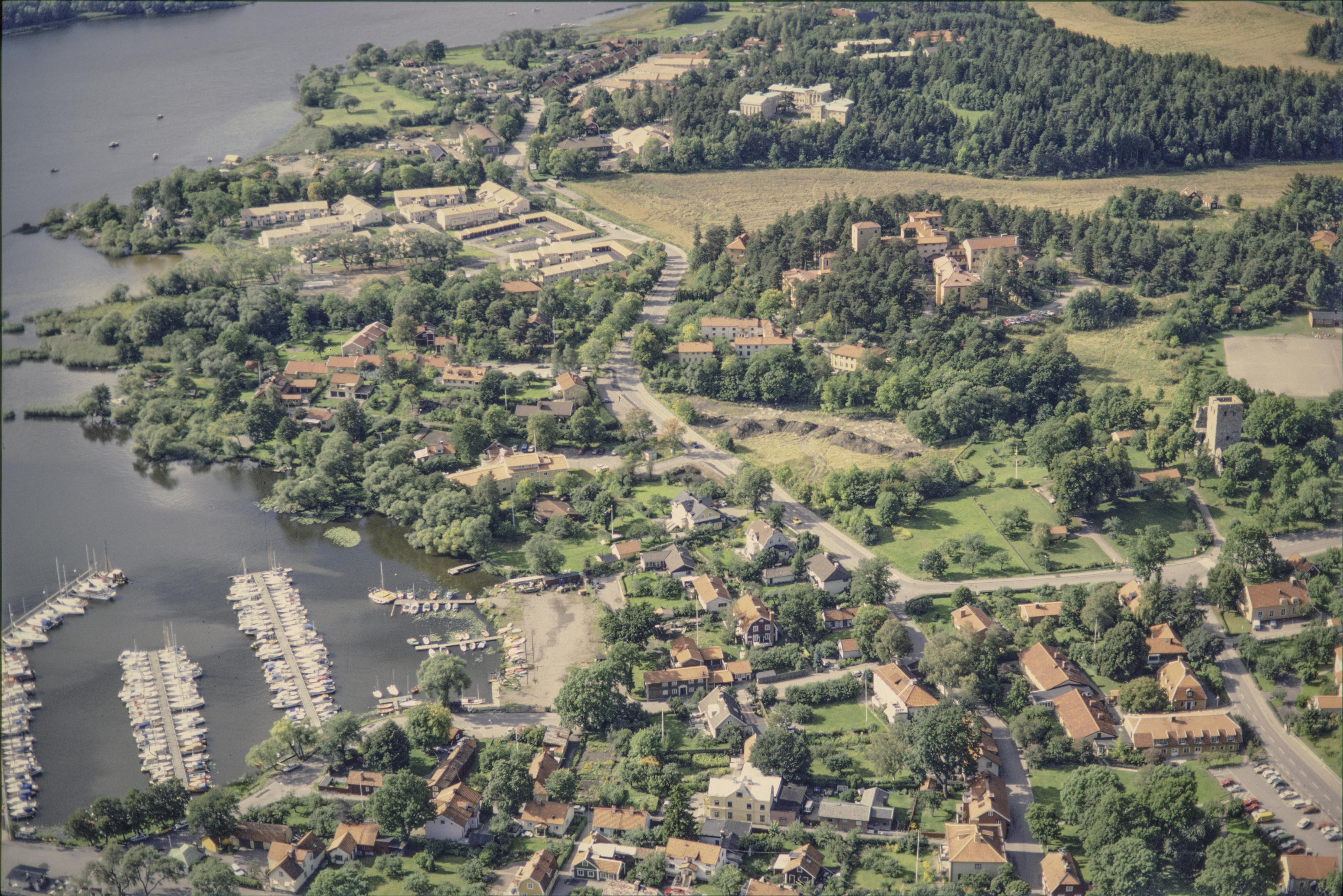 Beskrivning: Sigtuna stad vid Sigtunafjärden i Mälaren. Stadslager RAÄnr Sigtuna 195:1 m.fl. Till höger Sankt Pers kyrkoruin RAÄnr Sigtuna 22:1. Bilden är tagen mot (väderstreck): V