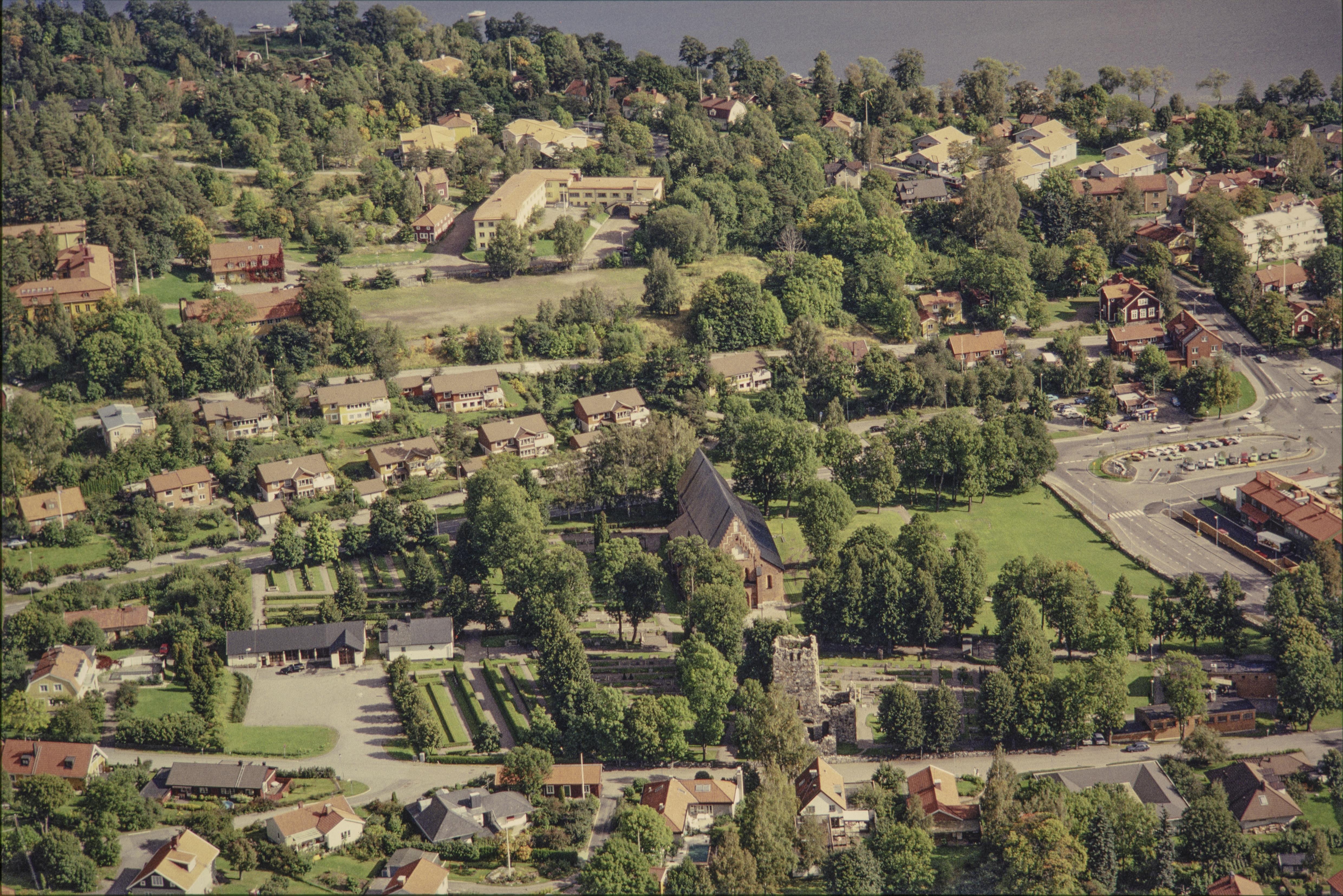 Beskrivning: Sigtuna stad vid Sigtunafjärden i Mälaren. Stadslager RAÄnr Sigtuna 195:1 m.fl. Vid bildens mitt Sankt Olofs kyrkoruin RAÄnr Sigtuna 22:1 och Mariakyrkan. Bilden är tagen mot (väderstreck): Ö