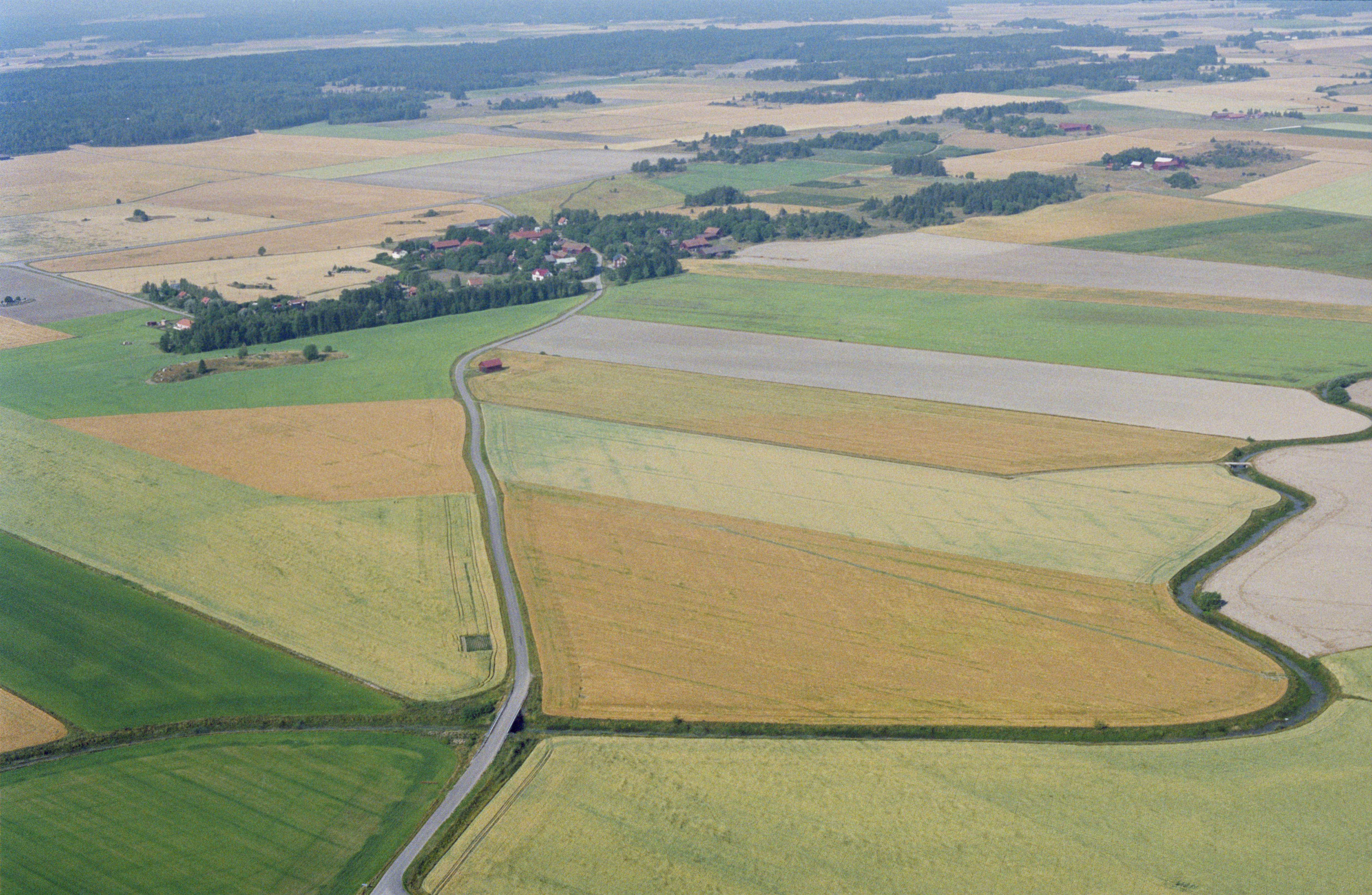 Beskrivning: Fjärdhundrabygden. I bildens nedre del Örsundaån vid gränsen mot socknet Frösthult och Gästre by. Till höger i bildens nedre del vadställe i Örsundaån RAÄnr Simtuna 160:1 sydväst om Hjältberga gård. Bilden är tagen mot (väderstreck): V
