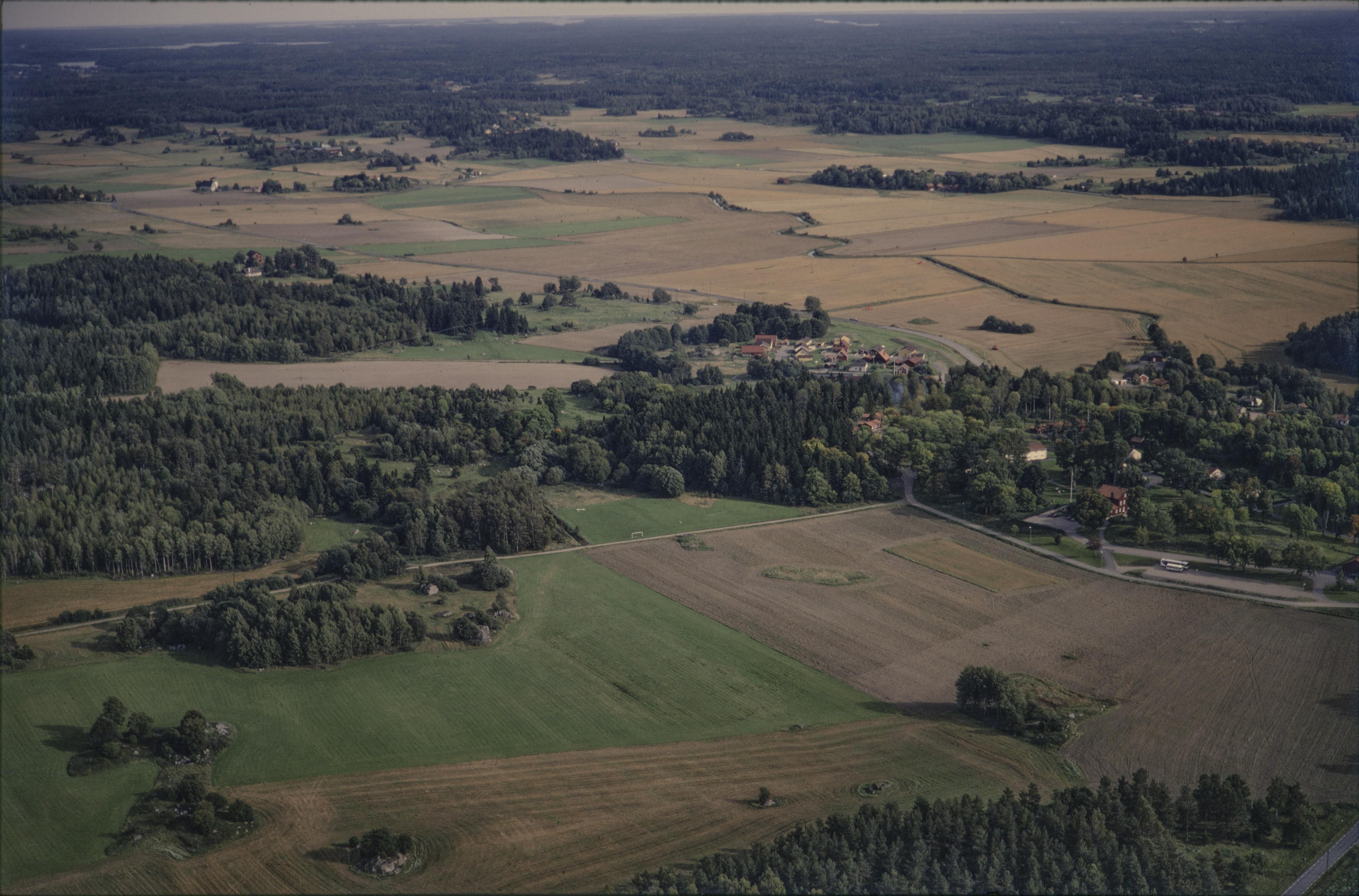 Beskrivning: Till höger Finsta herrgård i Finsta by. Vid bildens mitt fornminnen efter Heliga Birgitta "Birgittas grotta" RAÄnr Skederid 6:1. I bildens övre del Husbyån i dalgången mot Husby-Sjuhundra kyrka (uppe till vänster). Bilden är tagen mot (väderstreck): Ö