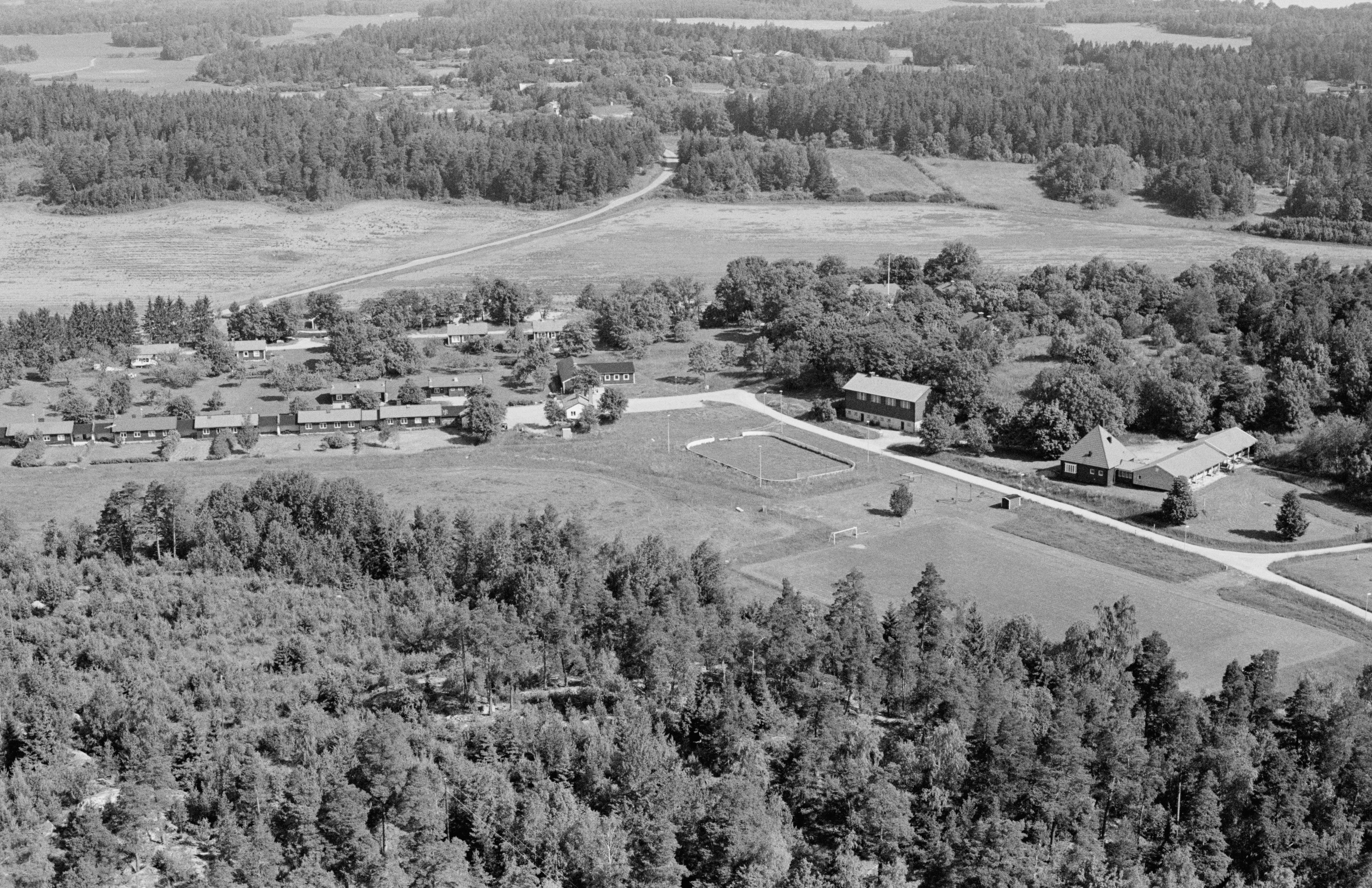 Beskrivning: Barnbyn Skå. Personalbostäder, idrottsanläggningar, samlingsbyggnader m.m. I bildens nedre del röse RAÄnr Skå 39:1. Bilden är tagen mot (väderstreck): NNO