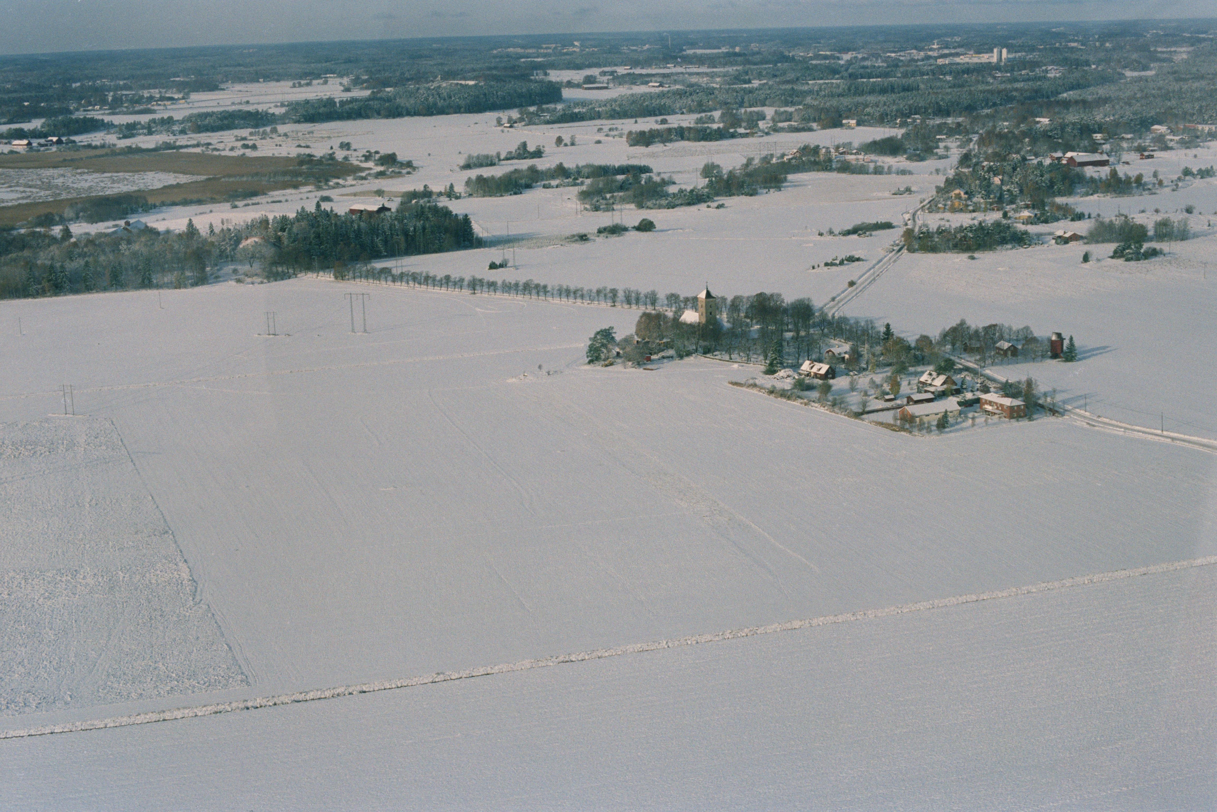 Beskrivning: Skånela kyrka och kyrkby. Till vänster i bildens övre del Skånelaholms slott vid sjön Fysingen. Bilden är tagen mot (väderstreck): VNV