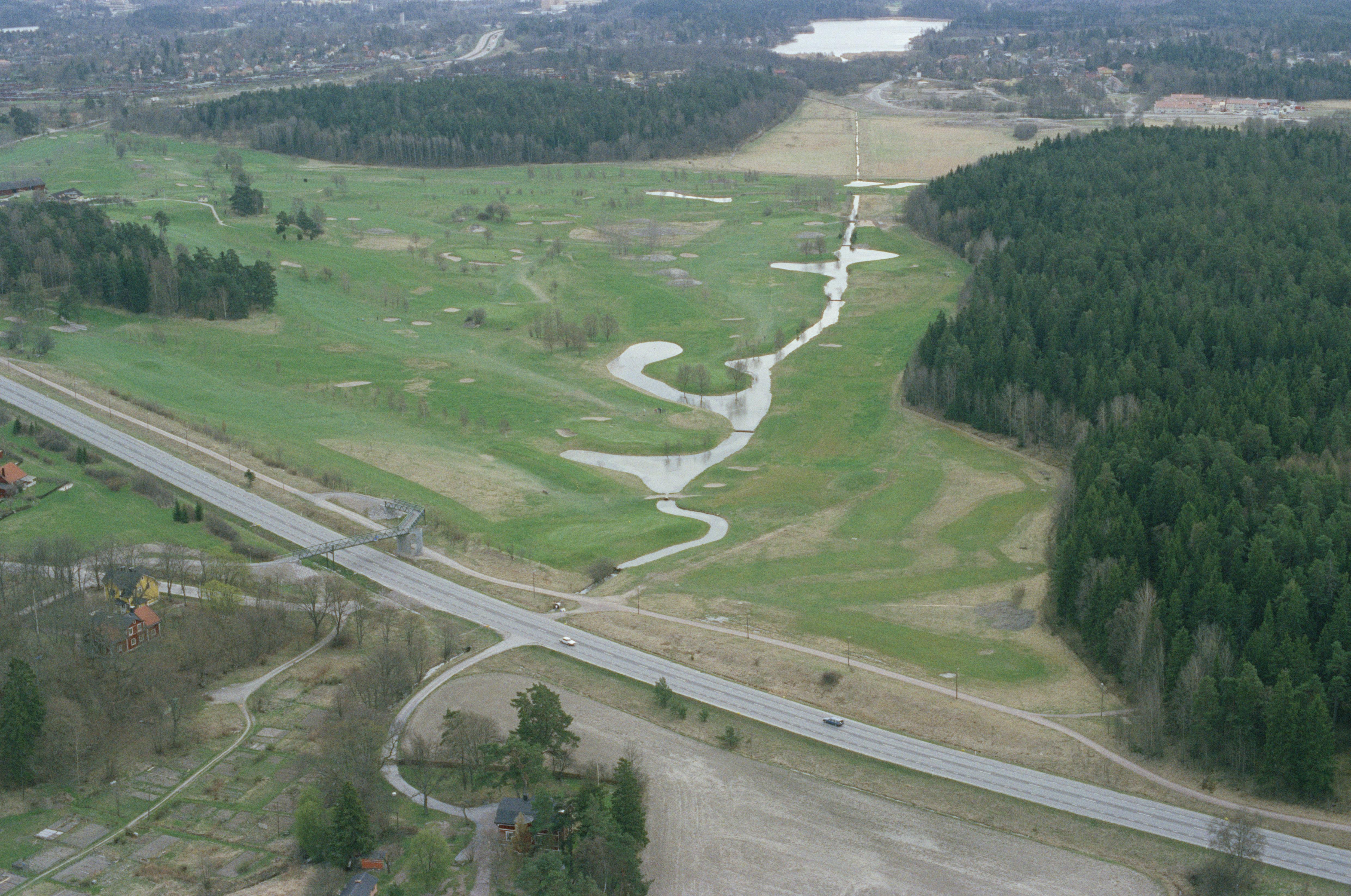 Beskrivning: Skillinge golfbana. Uppe till vänster gravfält RAÄnr Sollentuna 106:1 och Skillinge gamla tomt RAÄnr Sollentuna 107:1. Nere till höger gravfält RAÄnr Sollentuna 113:1 i Lillskogen. Sjön Norrviken i bildens övre del. Bilden är tagen mot (väderstreck): SSO