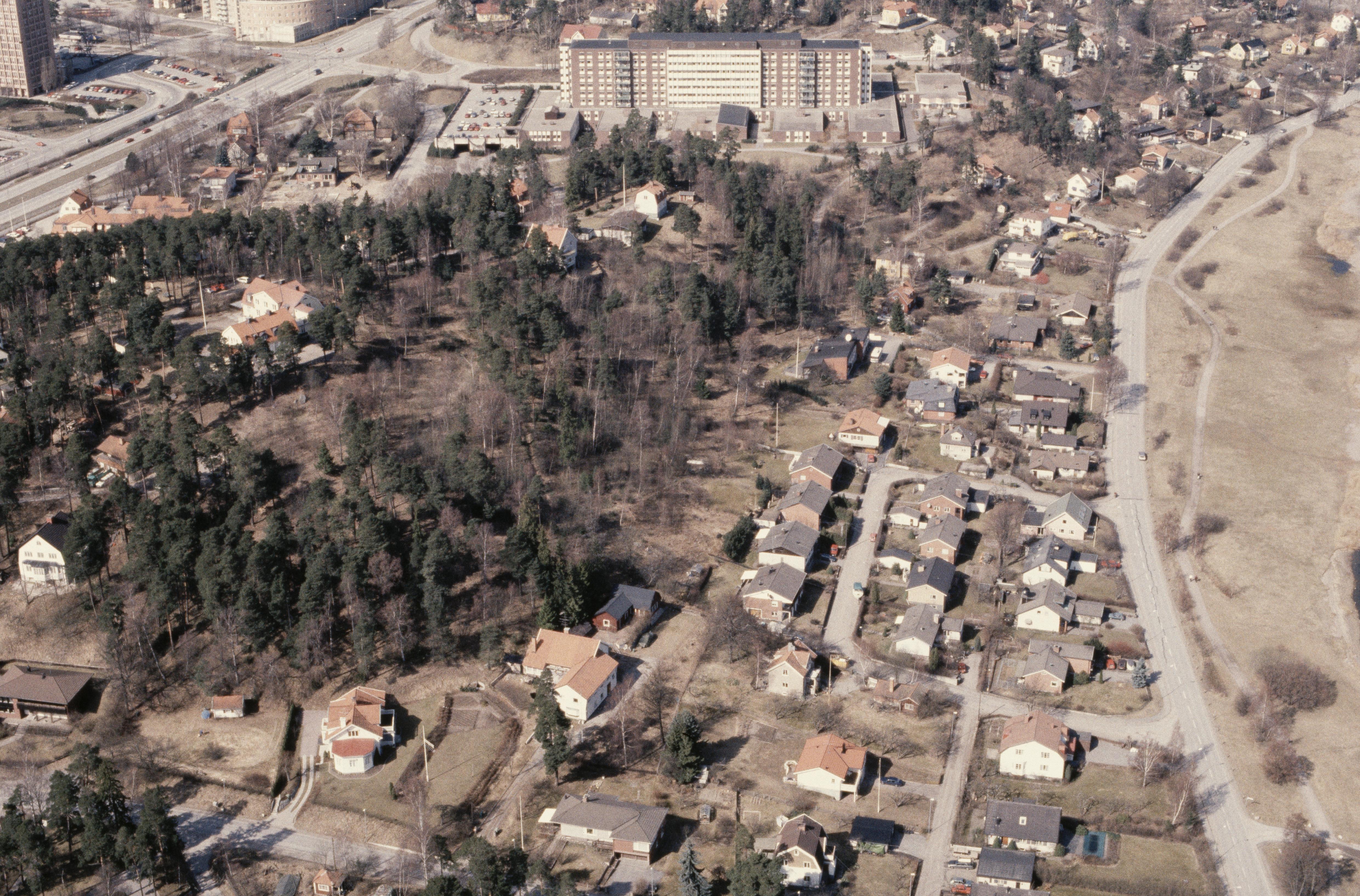 Beskrivning: Beskrivning: Sollentuna stad mellan Sollentunavägen (uppe till vänster) och Strandvägen (till höger) vid Edsviken. I bildens övre del sjukhuset i Nytorp. Bilden är tagen mot (väderstreck): NV Fotosyfte: Flygbildsdokumentation