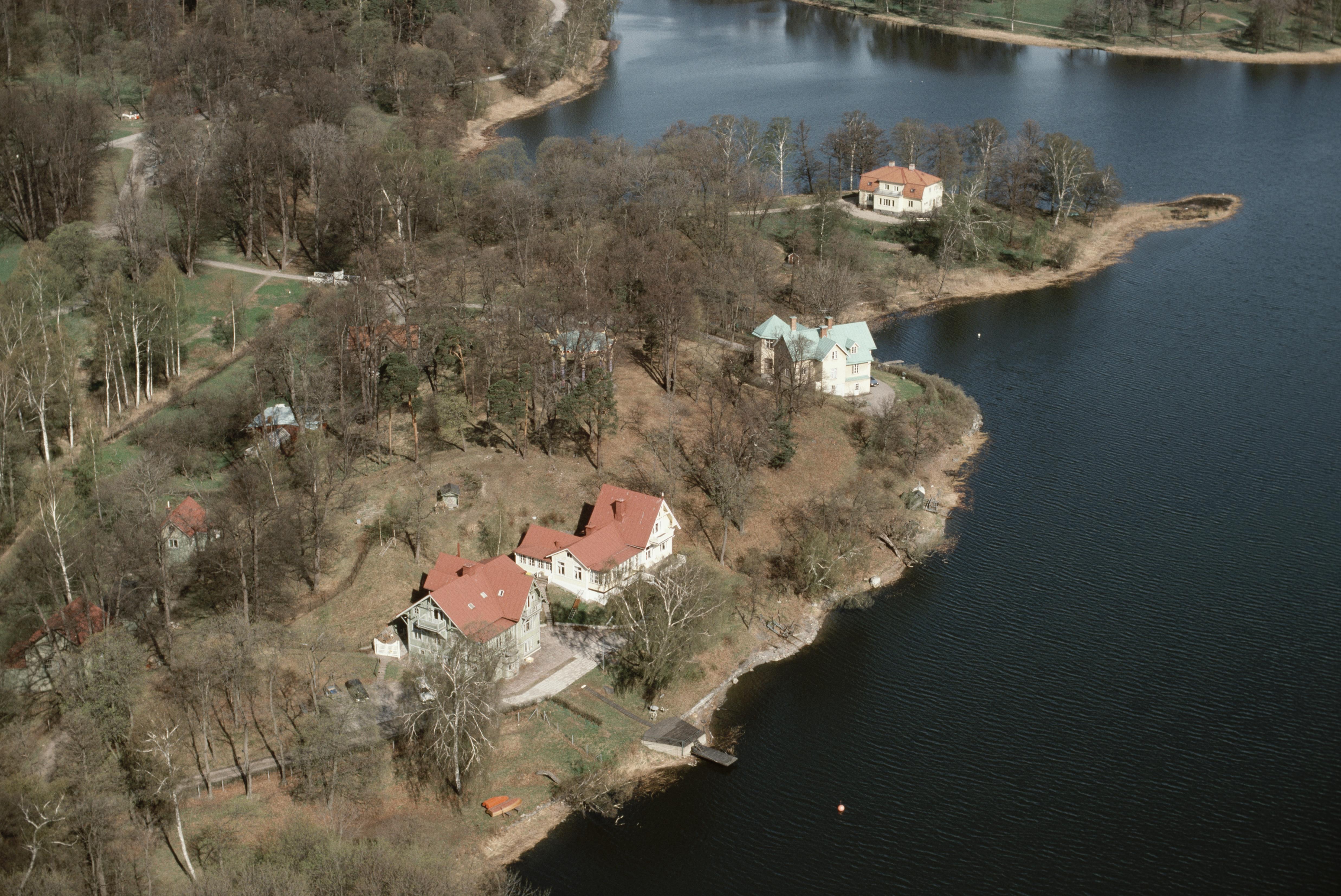 Beskrivning: Gamla Haga i Hagaparken vid Brunnsviken. Villa Japan, Villa Kina, Kinesiska paviljongen, Villa Valhalla och Villa Ädelsten. Bilden är tagen mot (väderstreck): NNV