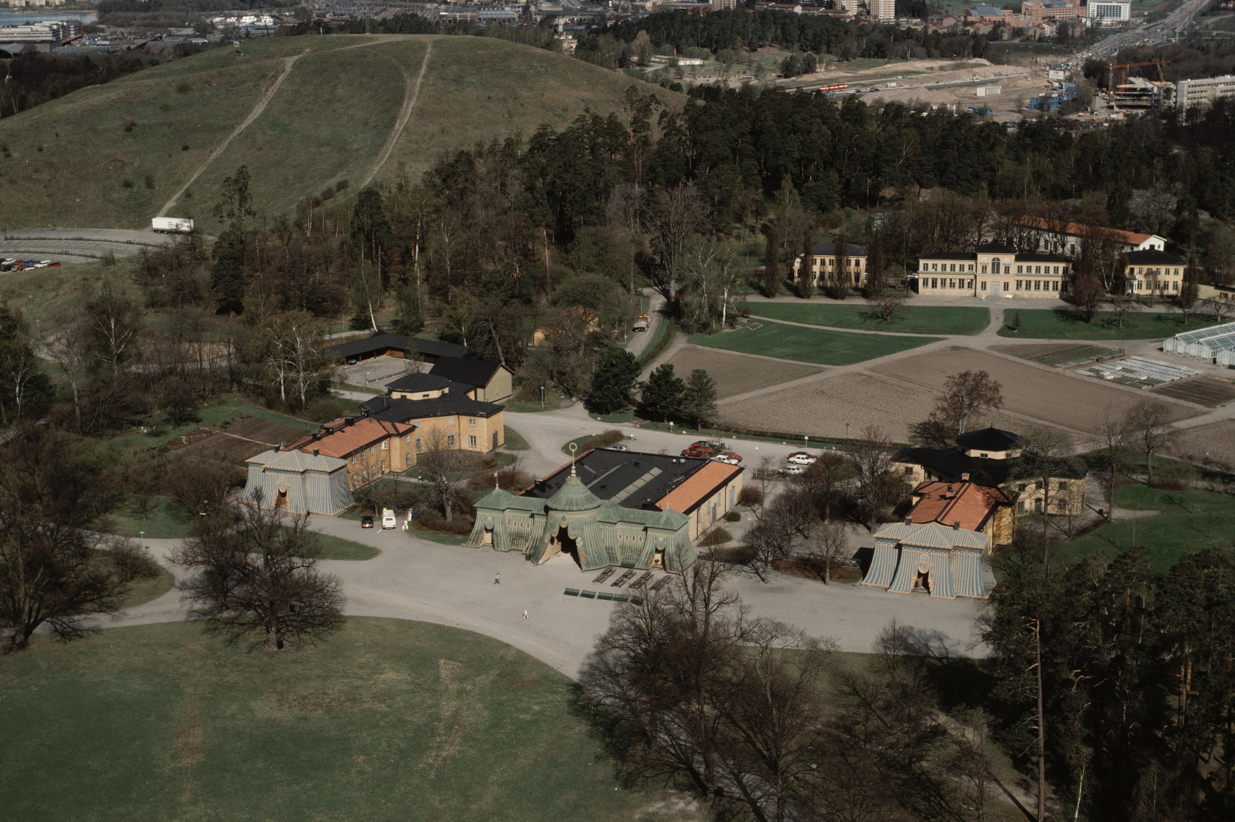 Beskrivning: Koppartälten vid Haga slott byggnadsminne RAÄnr Solna 30:1-3 i Hagaparken. I bildens övre del Fjärilshuset i Haga trädgård. Bilden är tagen mot (väderstreck): NV
