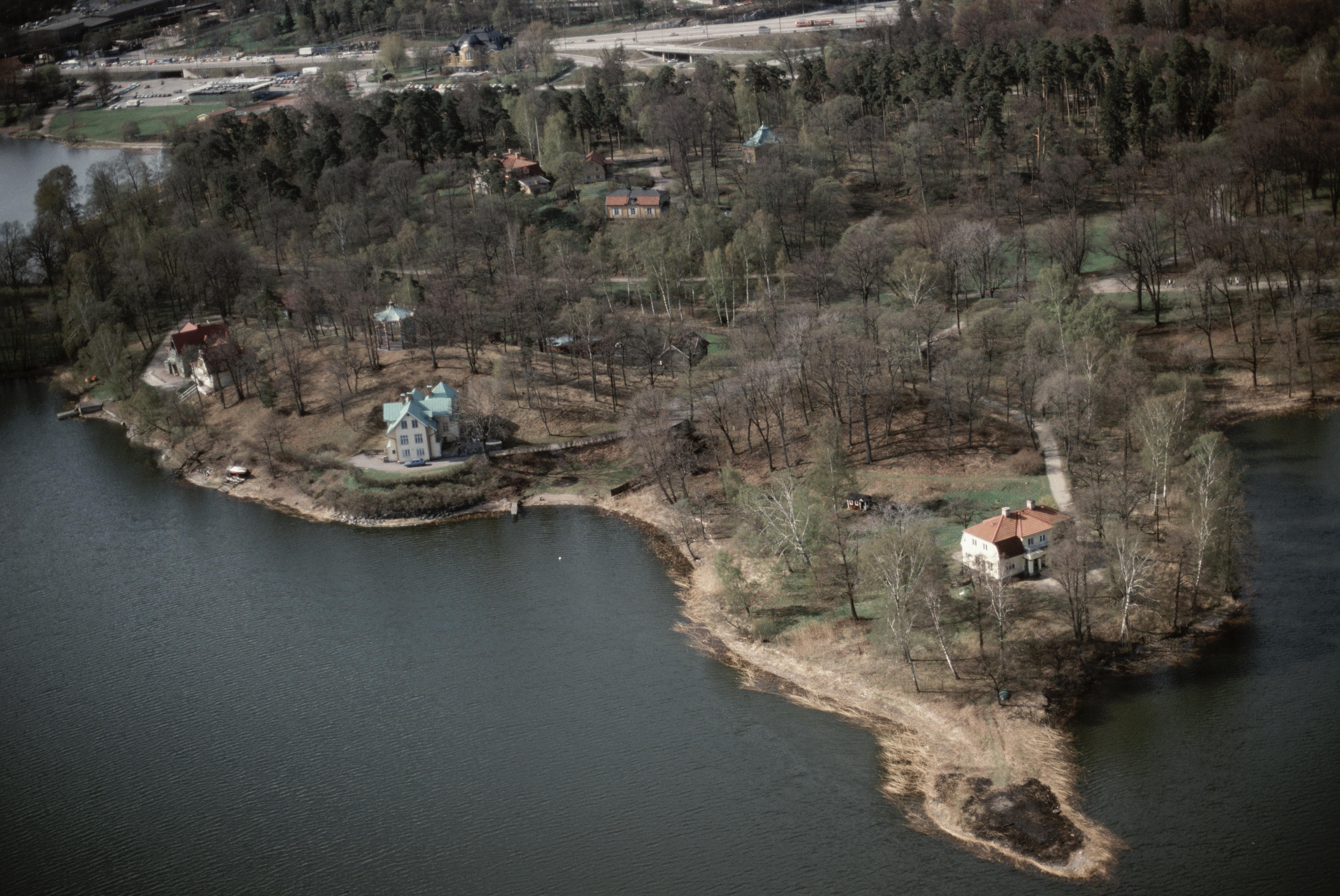Beskrivning: Gamla Haga RAÄnr Solna 30:1-3 i Hagaparken vid Brunnsviken. Kinesiska paviljongen, villorna Kina, Japan, Valhalla och Ädelsten. I bildens övre del Norrbacka. Bilden är tagen mot (väderstreck): SV