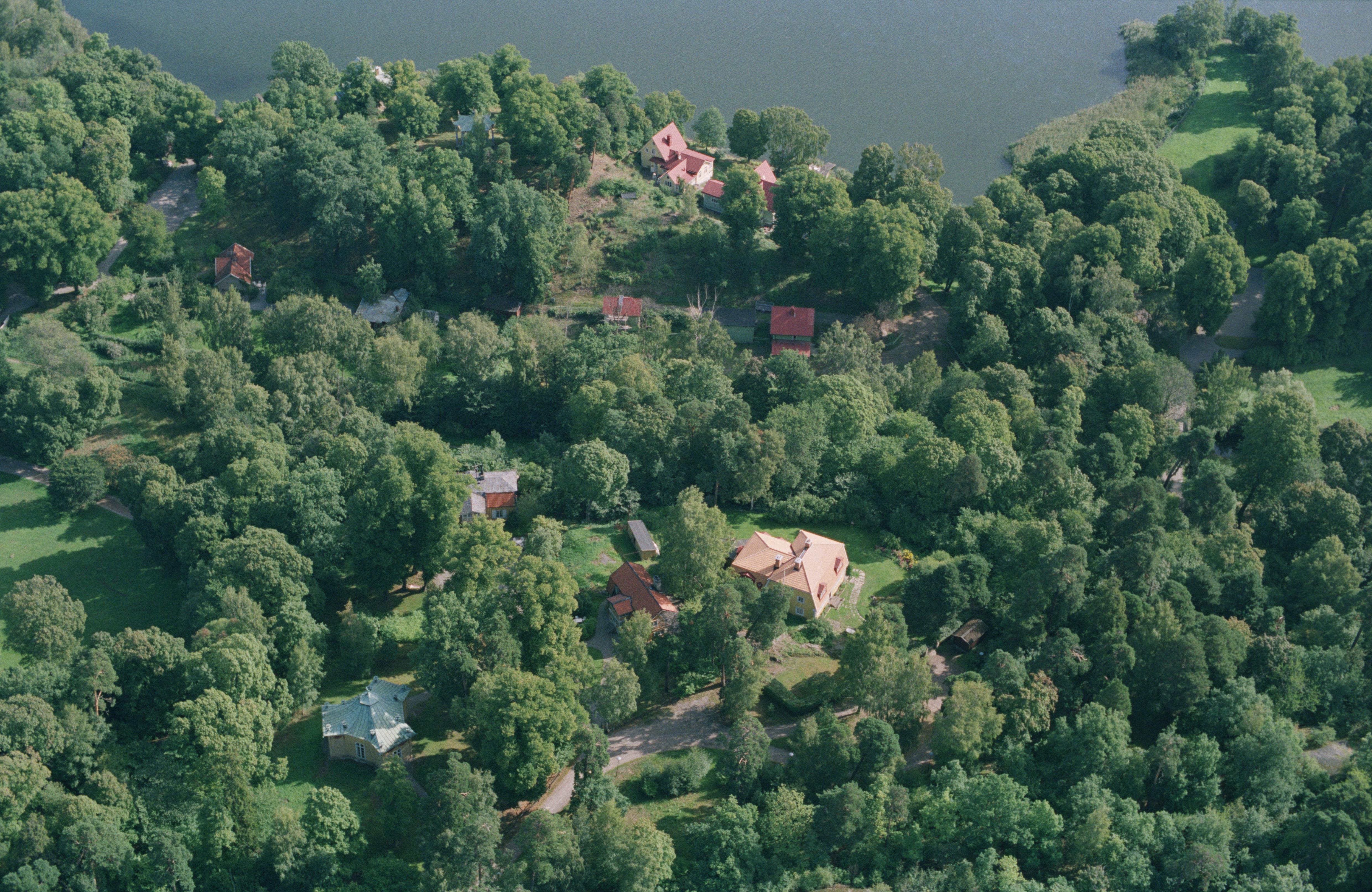 Beskrivning: Gamla Haga i Hagaparken vid Brunnsviken. Turkiska kiosken, villorna Ädelsten och Valhalla m.fl. På udden uppe till höger den kungliga gravplatsen RAÄnr Solna 59:1. Bilden är tagen mot (väderstreck): ONO