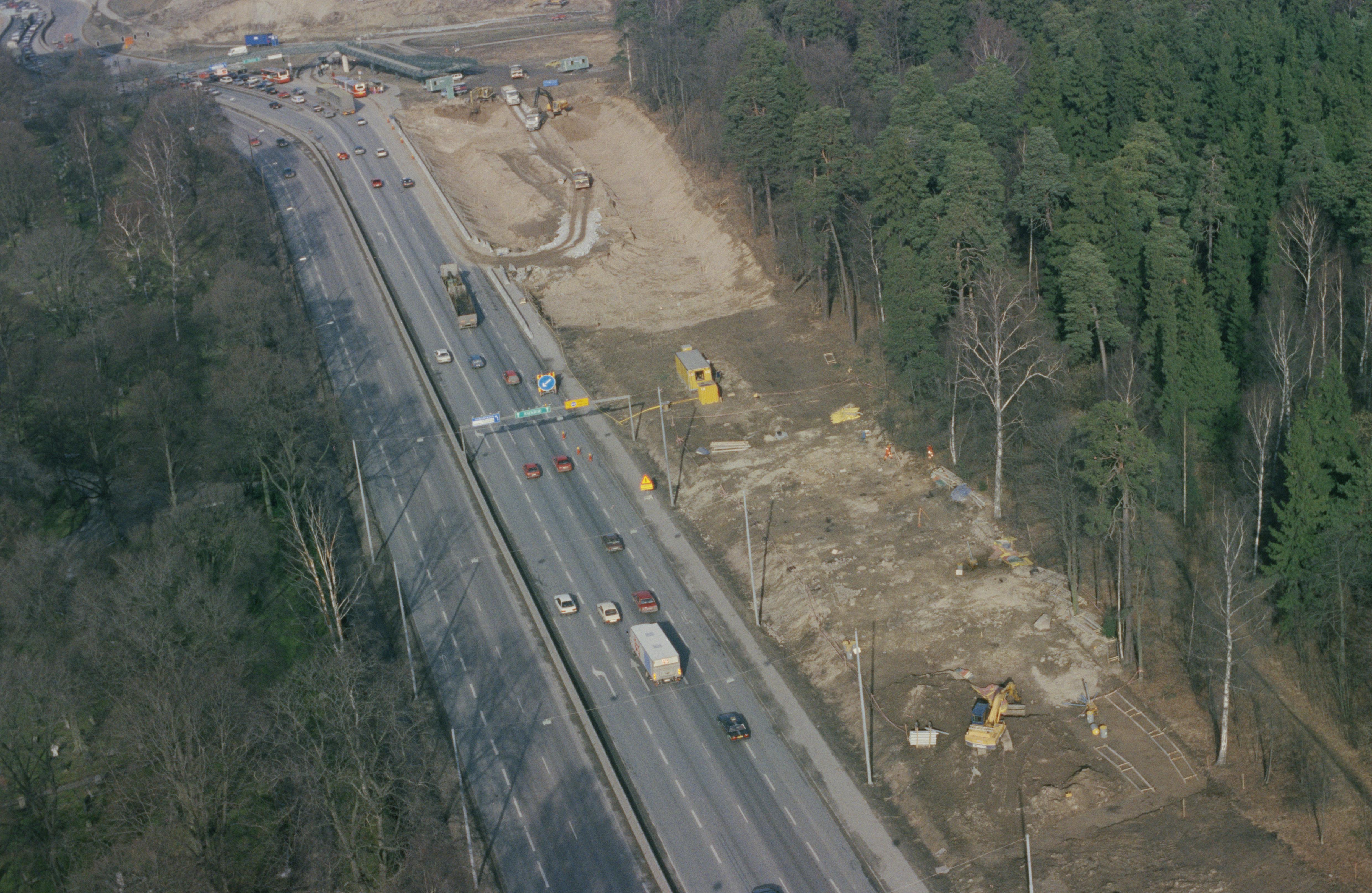 Beskrivning: Anmärkning (övrig): Riksintresse-nr/namn: AB37 - Solna. Socken: Solna. Motivering: A. Sockencentrum för den stora Solna socken, som ursprungligen innefattade hela nuvarande Stockholms innerstad, framför allt präglat av 1100-talets rundkyrka med senare tillbyggnader och tillhörande bebyggelse från främst 1700-talet. - B. Haga - Ulriksdals kungliga slottsmiljöer med lustslott och stora parkanläggningar med nära vattenkontakt, som i sin utveckling framför allt speglar stormaktstiden, den gustavianska epoken och 1800-talets första hälft. Miljöerna har ett nära samband med ett större område dominerat av kungarna och staten. - C. Norra begravningsplatsen, invigd 1827, som i planering och anläggningar visar begravnin(…) Texten i detta fält har förkortats vid migrering till e-arkivet. Se filbilagan extra.xml för fullständig information under note_archivist. Beskrivning: Arkeologisk undersökning vid väg E4 mellan Norra begravningsplatsen och Hagaparken. Boplats RAÄnr Solna 85:1. Bilden är tagen mot (väderstreck): N Fotosyfte: Flygbildsdokumentation