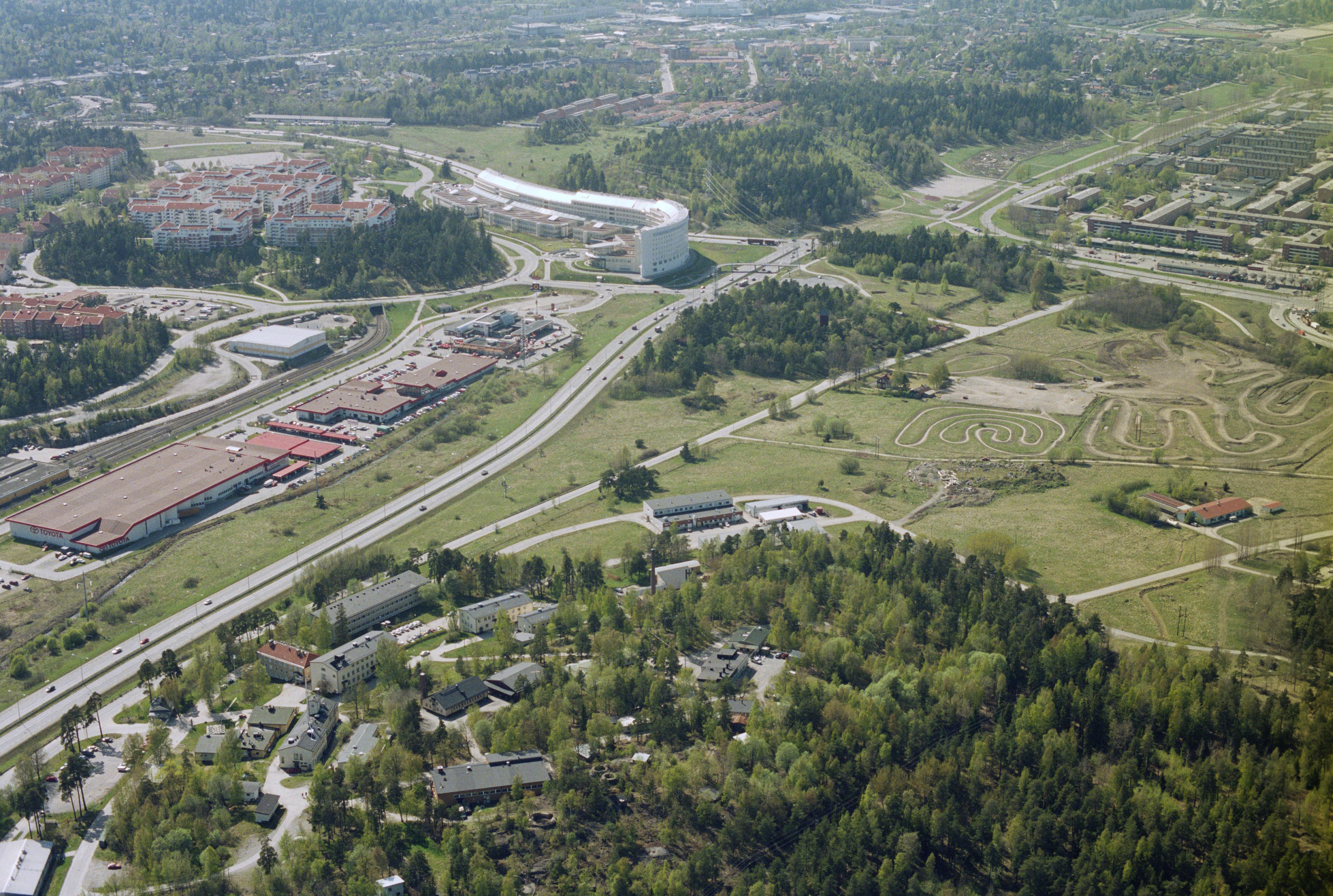 Beskrivning: Området Rissne vid Ulvsundavägen som markerar gränsen mellan socknen Sundbyberg (i bildens vänstra del) och Stockholm (i bildens högra del). Över bildens mitt byggnaden Bankhus 90 och Rinkeby kvarn RAÄnr Sundbyberg 18:1. Bilden är tagen mot (väderstreck): VSV