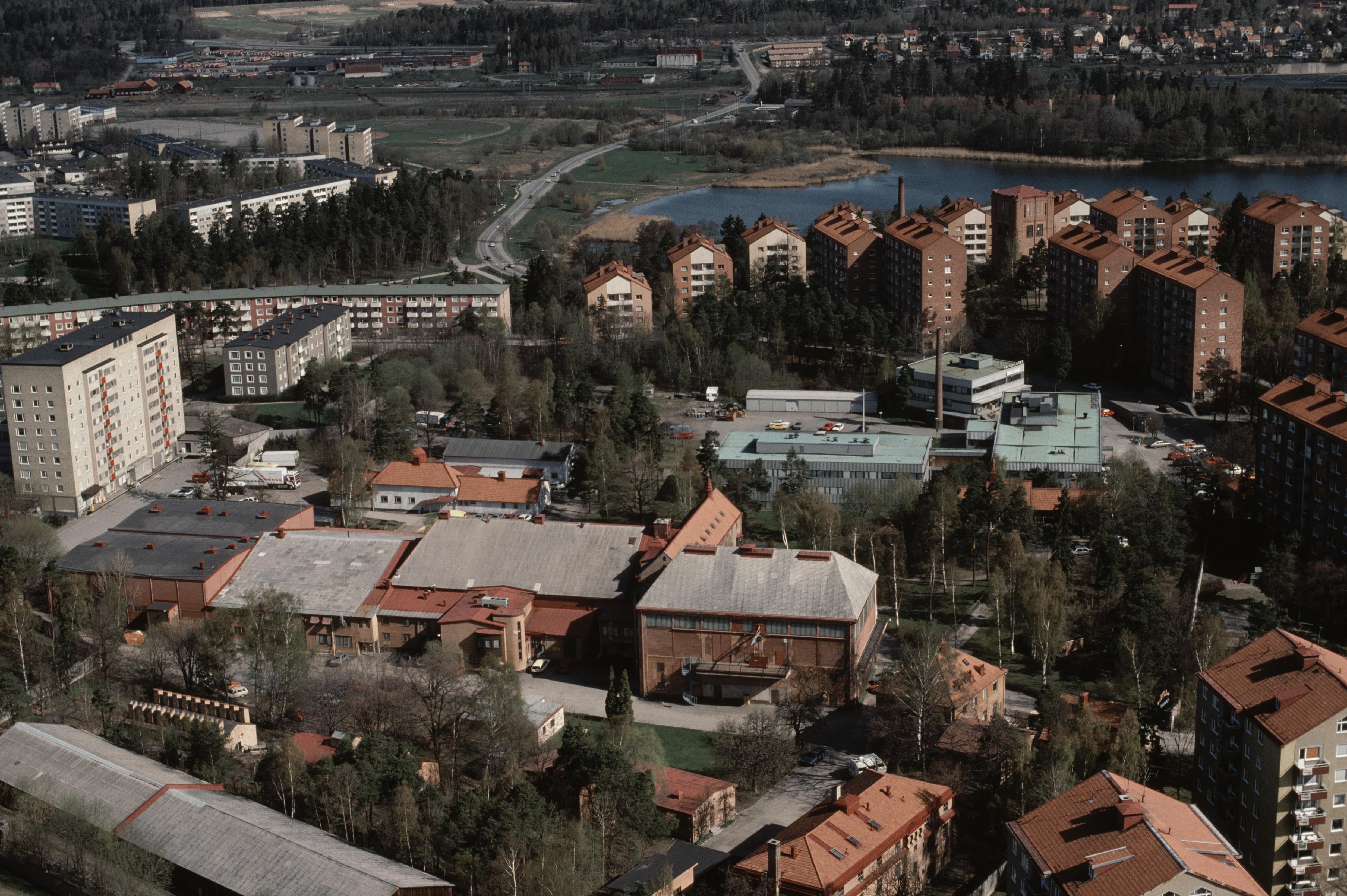 Beskrivning: Stadsdelen Råsunda i Solna stad. Vid bildens mitt Filmstaden i Råsunda. I bildens övre del naturreservatet vid Råstasjön. Bilden är tagen mot (väderstreck): N