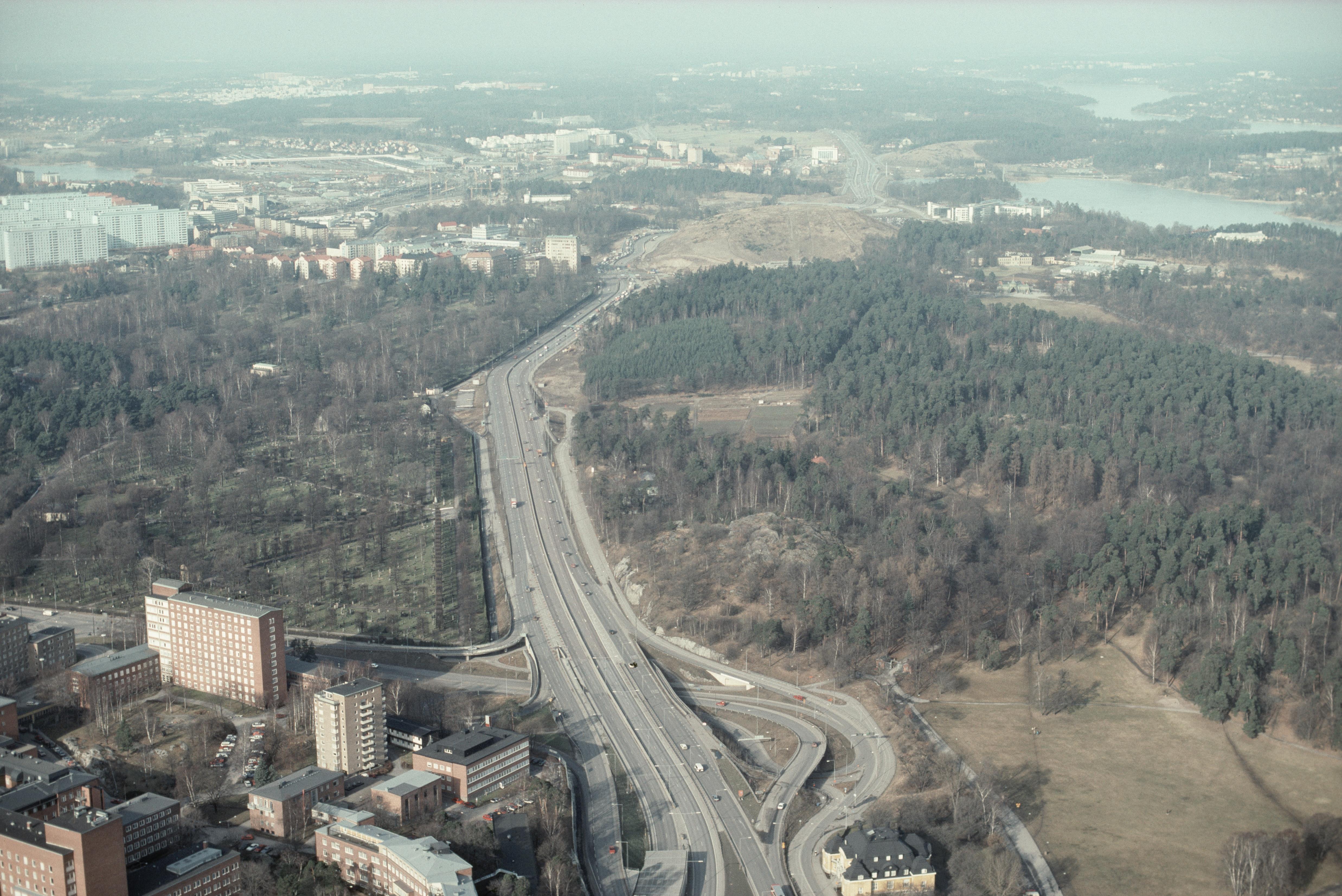 Beskrivning: Nere till vänster Karolinska Universitetssjukhuset. Till höger Haga Tingshus och Gamla Haga i Hagaparken RAÄnr Solna 30:1-3. I bildens övre del Hagahuset och Hagakullen i Haga Norra. Bilden är tagen mot (väderstreck): NV