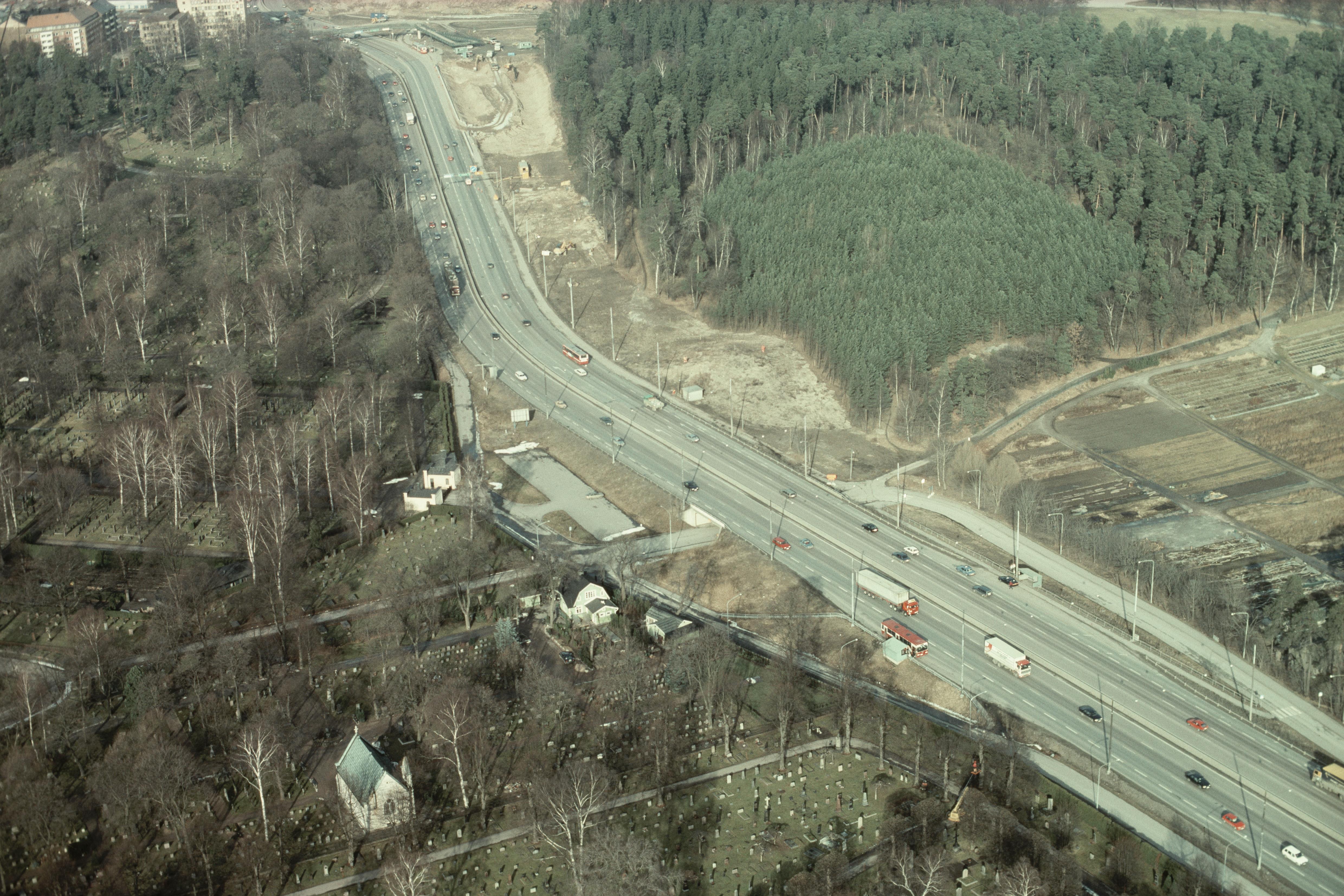 Beskrivning: Arkeologisk undersökning vid väg E4 mellan Norra begravningsplatsen och Hagaparken. Boplats RAÄnr Solna 85:1. Romersk-katolska kapellet nere till vänster, Hagahuset uppe till vänster. Bilden är tagen mot (väderstreck): N