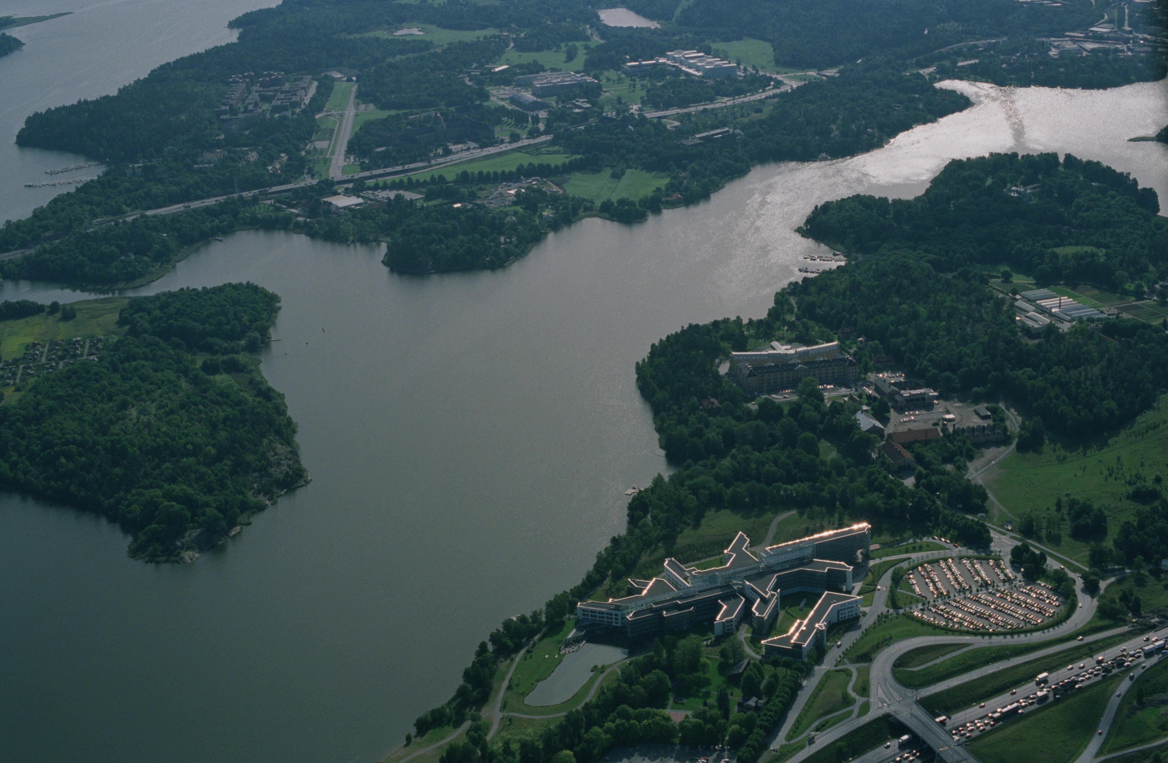 Beskrivning: Till höger om bildens mitt "The SAS Frösundavik Office Building" i ett tidigare militärt område och byggnadsminne RAÄnr Solna 31:1 vid Brunnsviken. Bilden är tagen mot (väderstreck): OSO