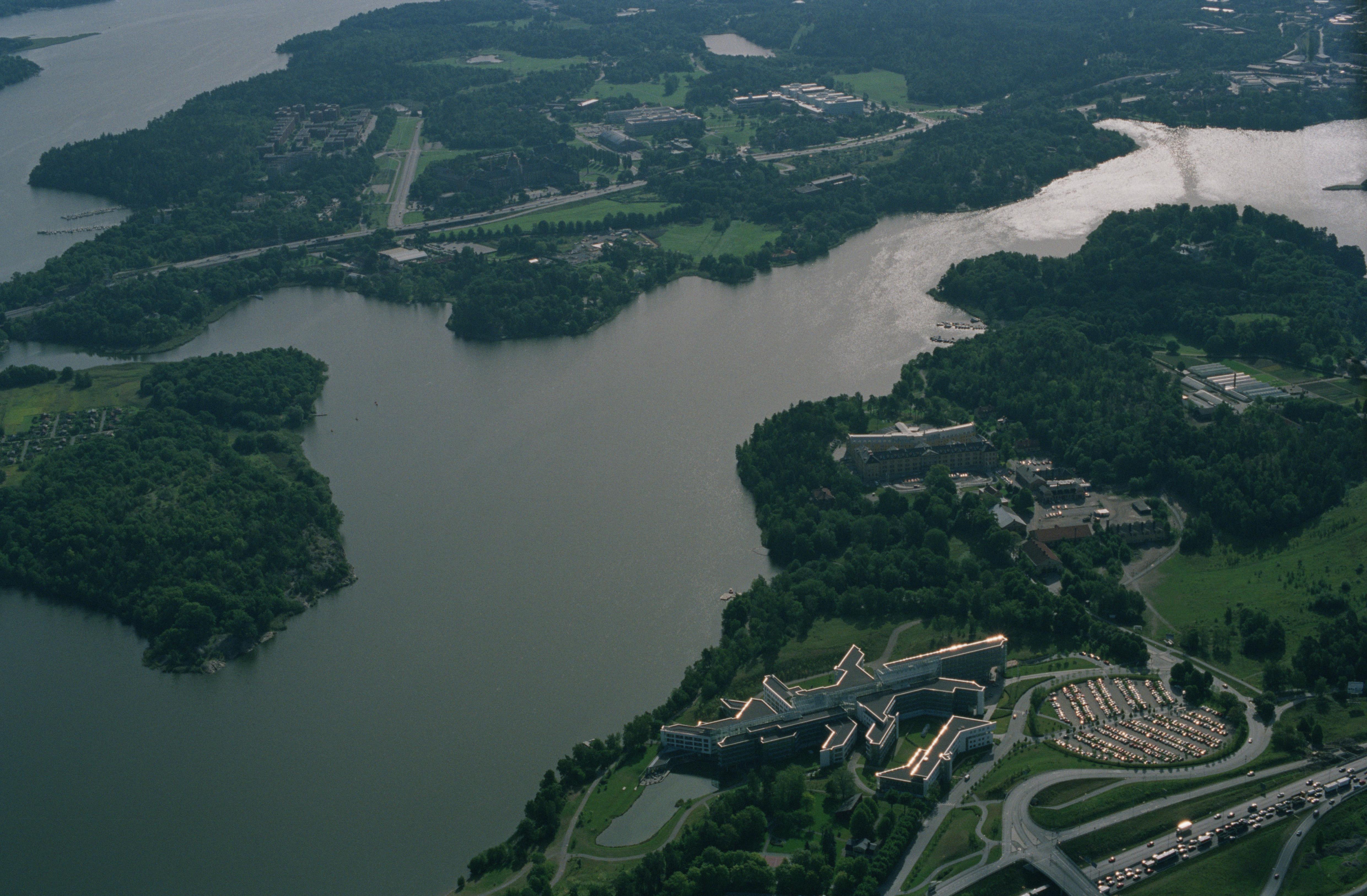 Beskrivning: Till höger om bildens mitt "The SAS Frösundavik Office Building" i ett tidigare militärt område och byggnadsminne RAÄnr Solna 31:1 vid Brunnsviken. Bilden är tagen mot (väderstreck): OSO