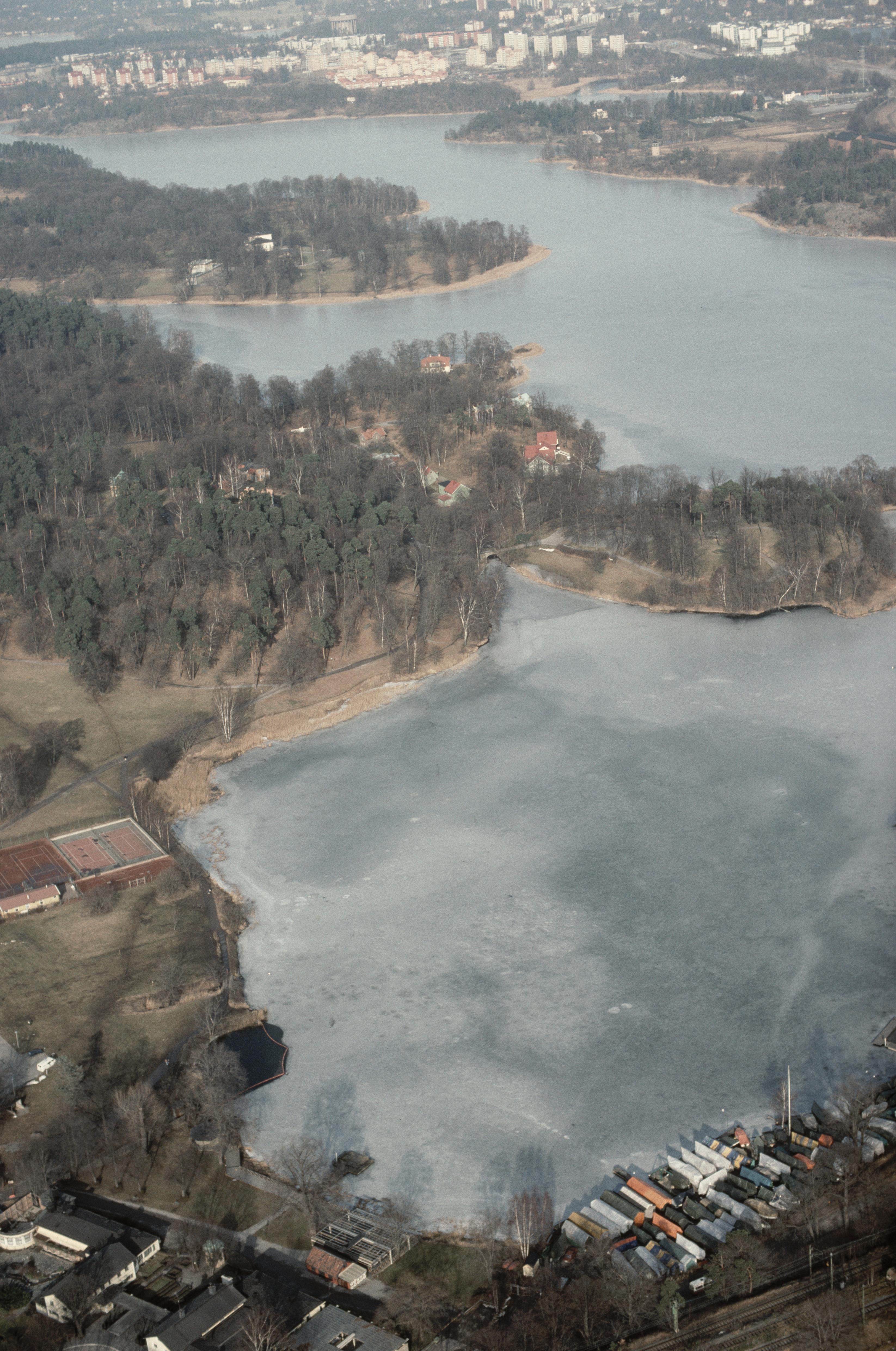 Beskrivning: Brunnsviken vid Haga Södra på gränsen mellan Solna socken och Stockholm. I bildens nedre del området vid Stallmästargården. Vid bildens mitt Gamla Haga och Hagaparken. I bildens övre del Haga slott. Bilden är tagen mot (väderstreck): N