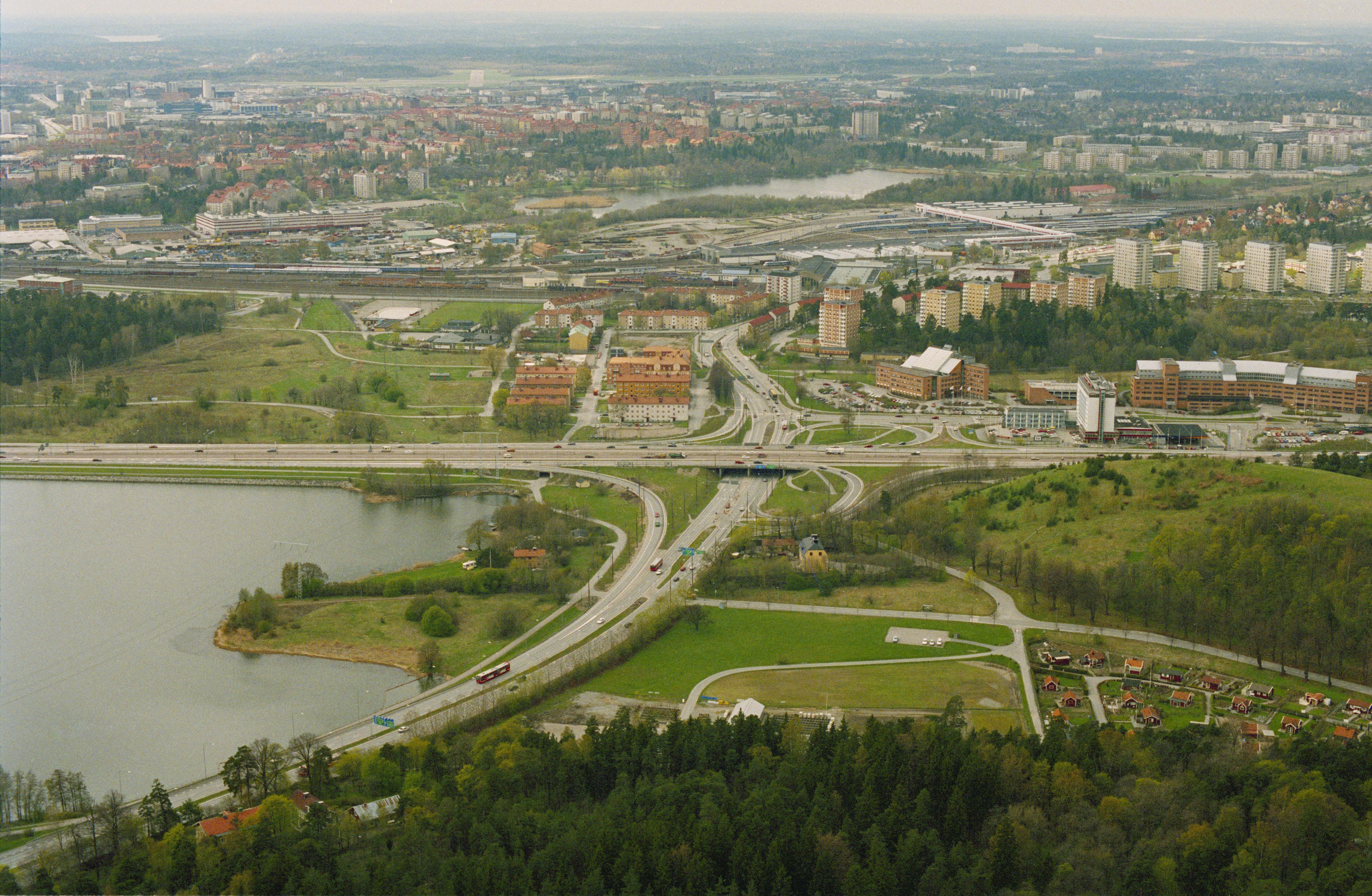 Beskrivning: Brunnsviken till vänster. Vid bildens mitt trafikplats Järva krog vid Jakobsdal. Till höger södra delen av Ulriksdal RAÄnr Solna 32:1. Bilden är tagen mot (väderstreck): SV