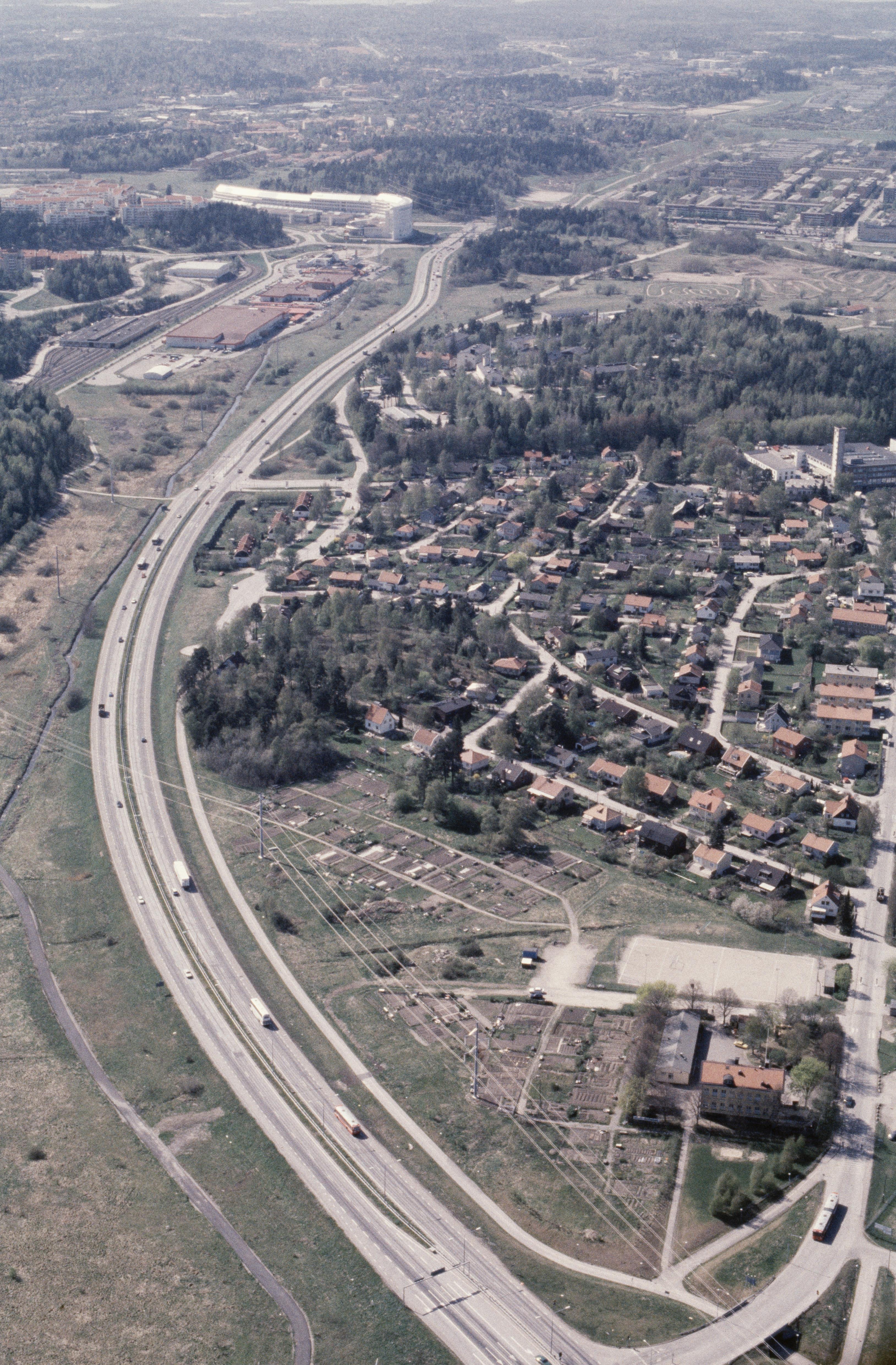 Beskrivning: Området Ursvik. Gravfält RAÄnr Sundbyberg 10:1 till höger vid bildens mitt. Uppe till vänster byggnaden Bankhus 90 i området Rissne. Bilden är tagen mot (väderstreck): VSV