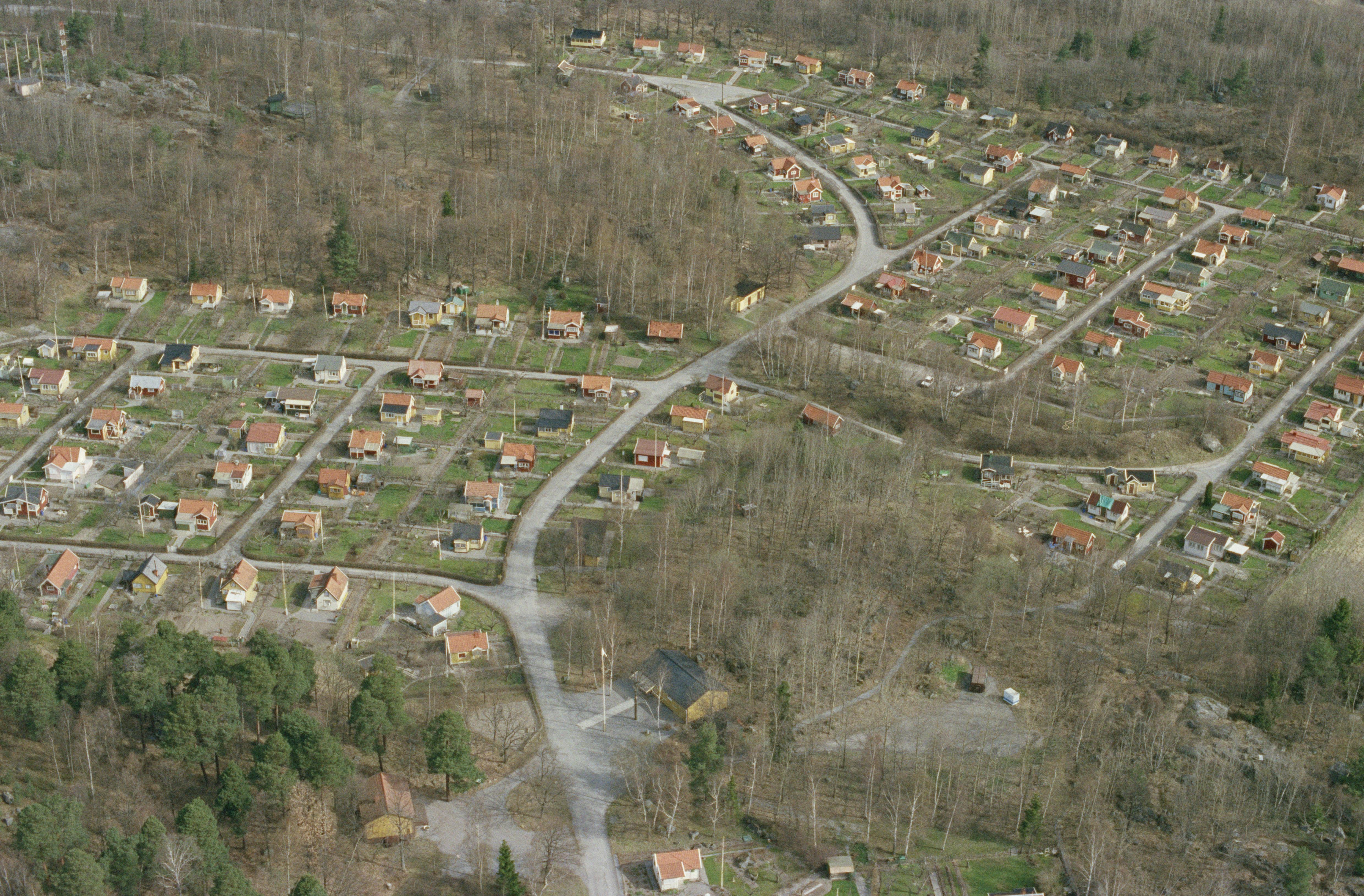 Beskrivning: Stadsdelen Bromma i Stockholms Västerort. Koloniträdgård Kortenslund sydväst om Bromma flygplats. Bilden är tagen mot (väderstreck): NNO