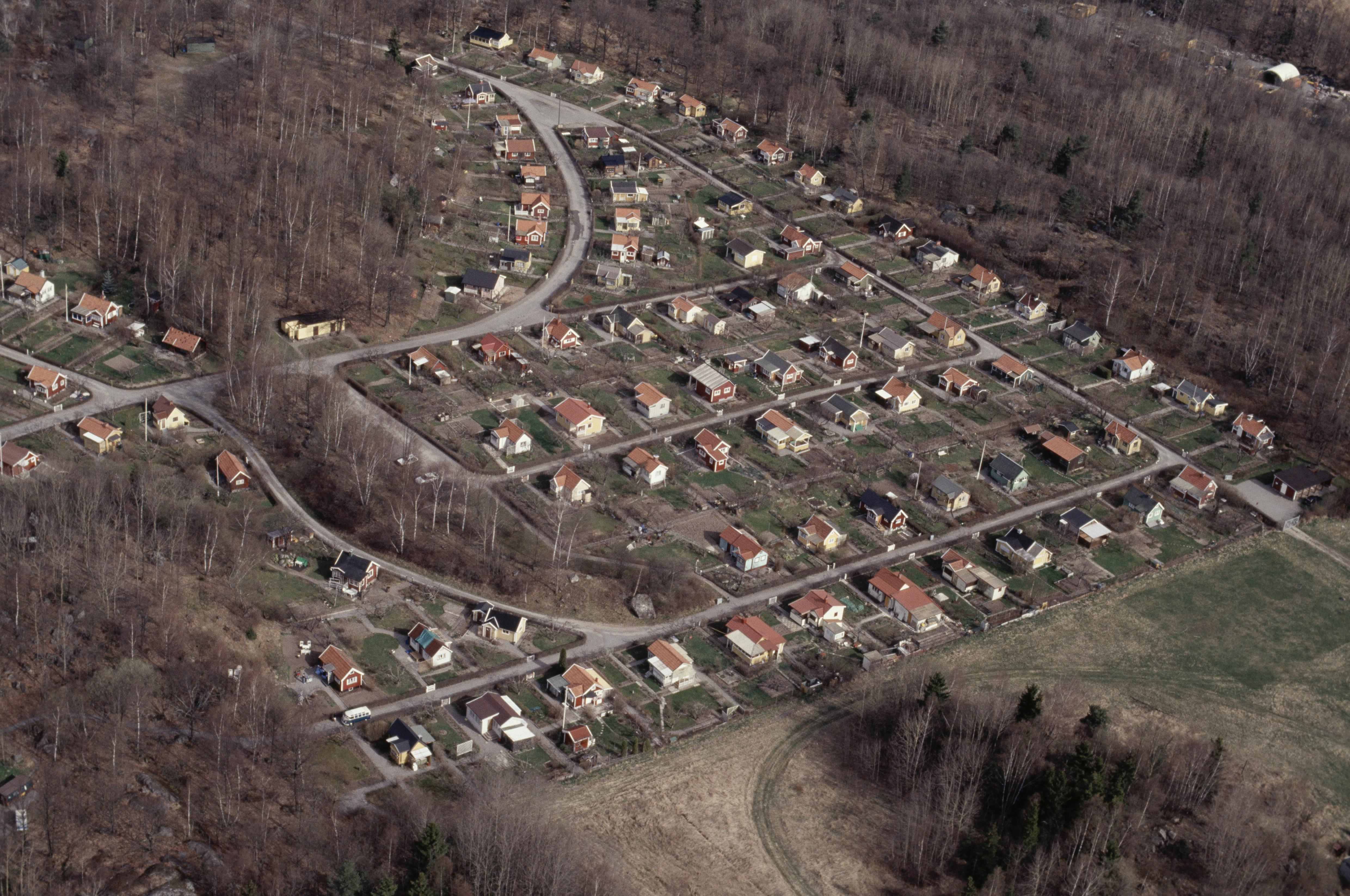 Beskrivning: Stadsdelen Bromma i Stockholms Västerort. Koloniträdgård Kortenslund sydväst om Bromma flygplats. Bilden är tagen mot (väderstreck): N