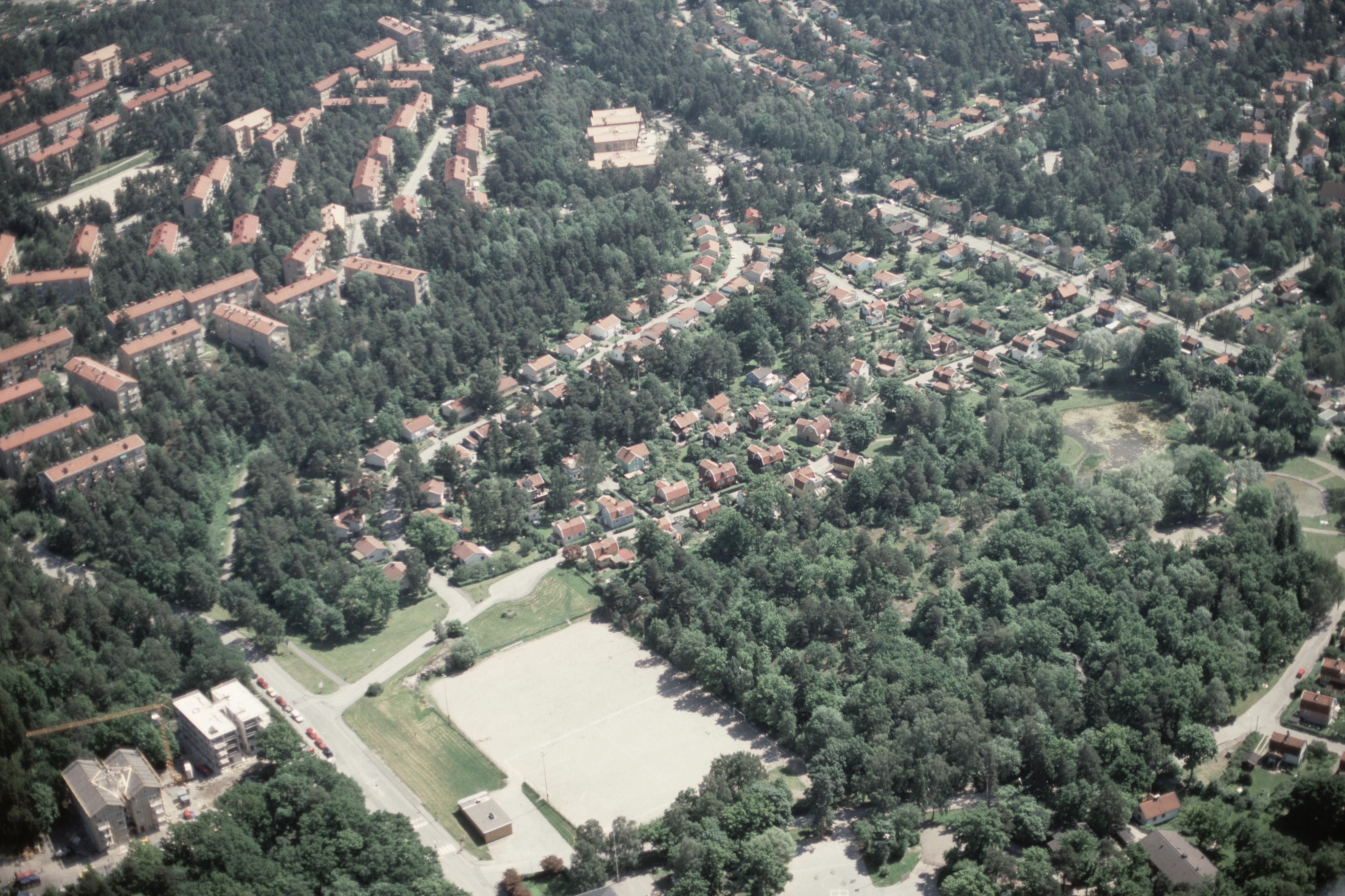 Beskrivning: Området Olovslund i stadsdelen Bromma i Stockholms Västerort. Till höger om bildens mitt Olovslunden med stensättningar RAÄnr Bromma 10:1-2. Bilden är tagen mot (väderstreck): SO