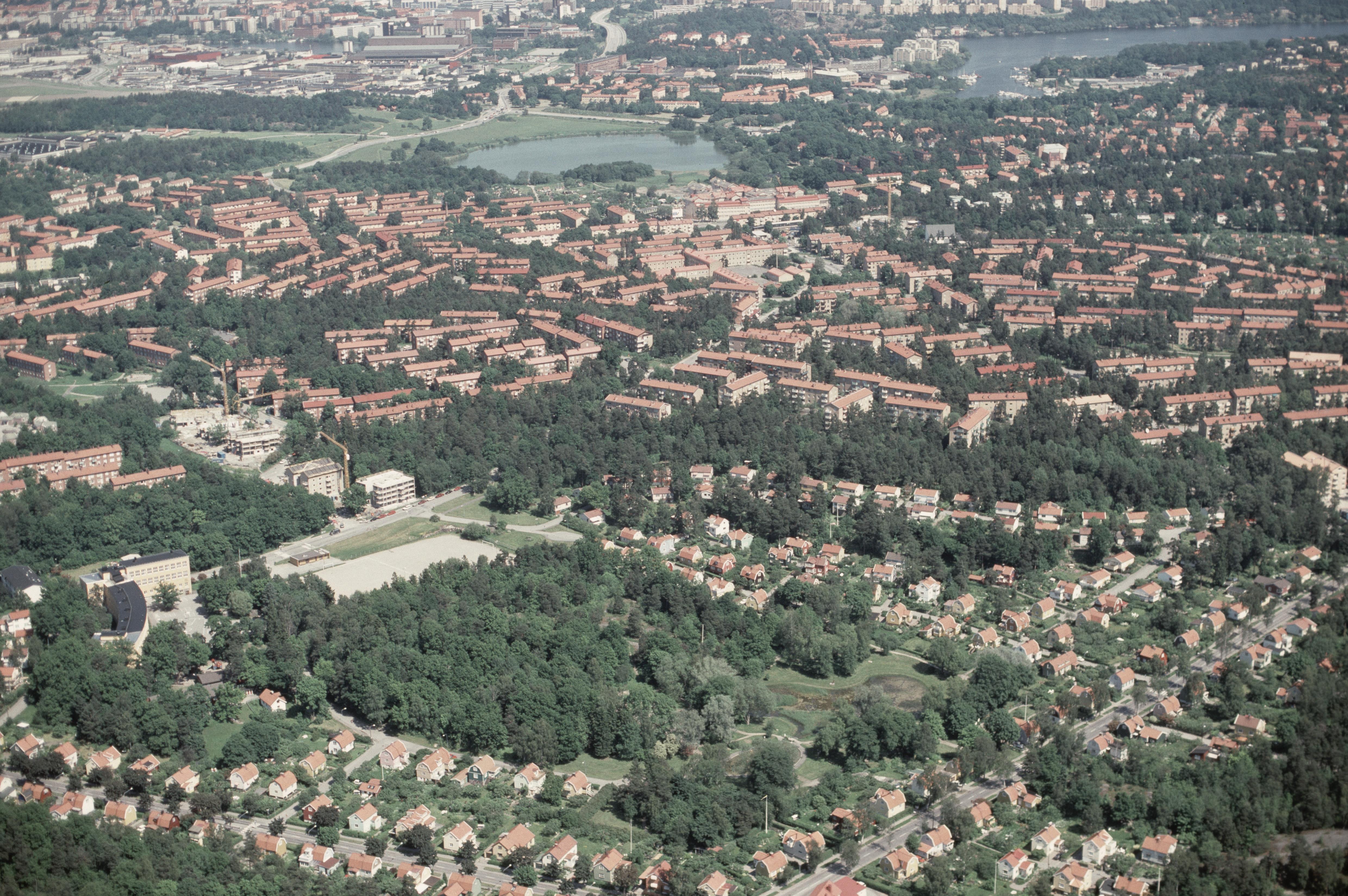 Beskrivning: Området Olovslund i stadsdelen Bromma i Stockholms Västerort. Till vänster under bildens mitt Olovslunds skola vid Olovslunden med stensättningar RAÄnr Bromma 10:1-2. I bildens övre del området Abrahamsberg mot Lillsjön och Ulvsundasjön i Mälaren och längst upp Solna socken. Bilden är tagen mot (väderstreck): NO