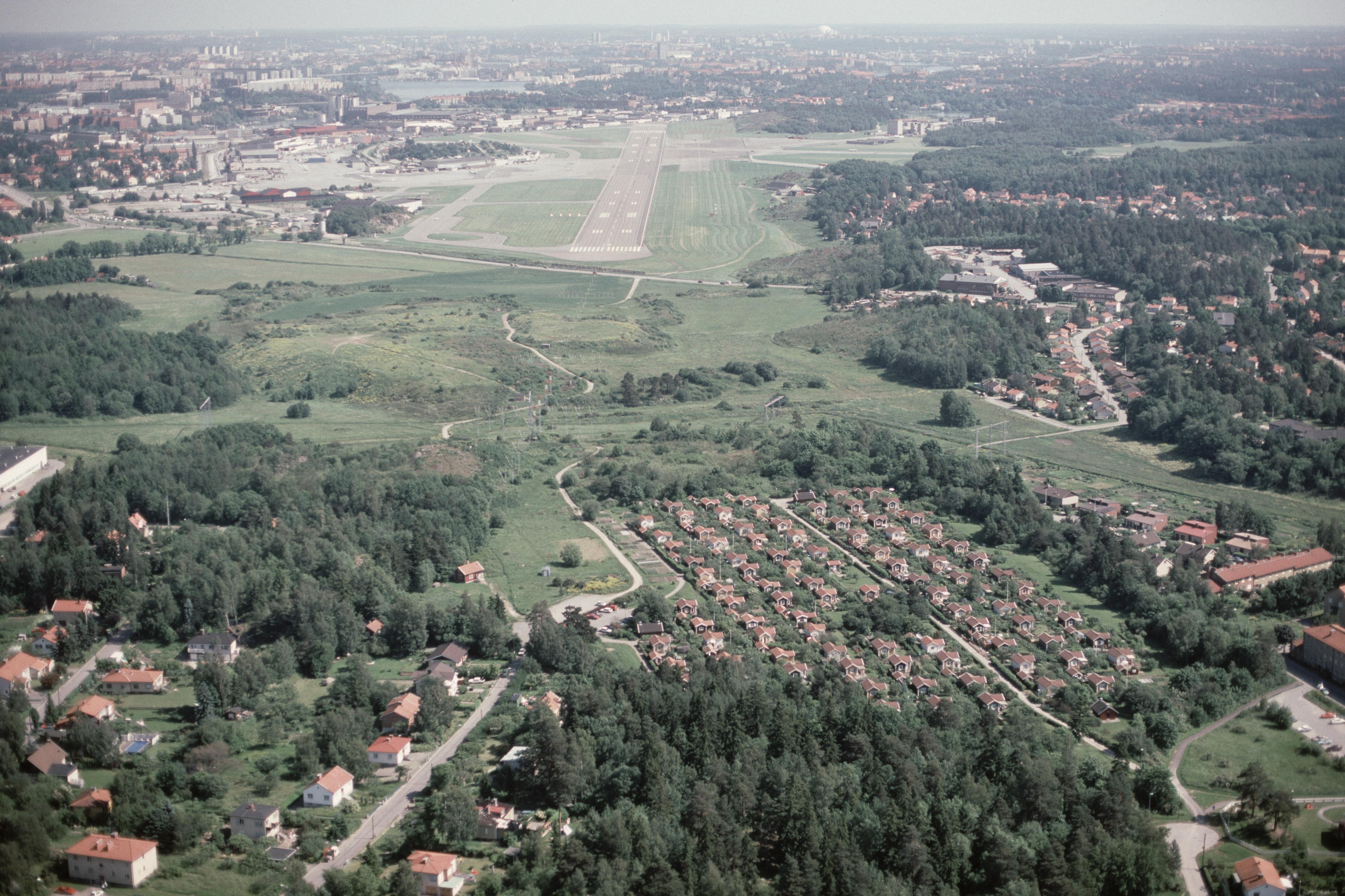 Beskrivning: Områdena Flysta och Sundby. Till höger koloniträdgård vid Sundby. I bildens övre del Bromma flygplats mot Stockholms stad. Bilden är tagen mot (väderstreck): SO