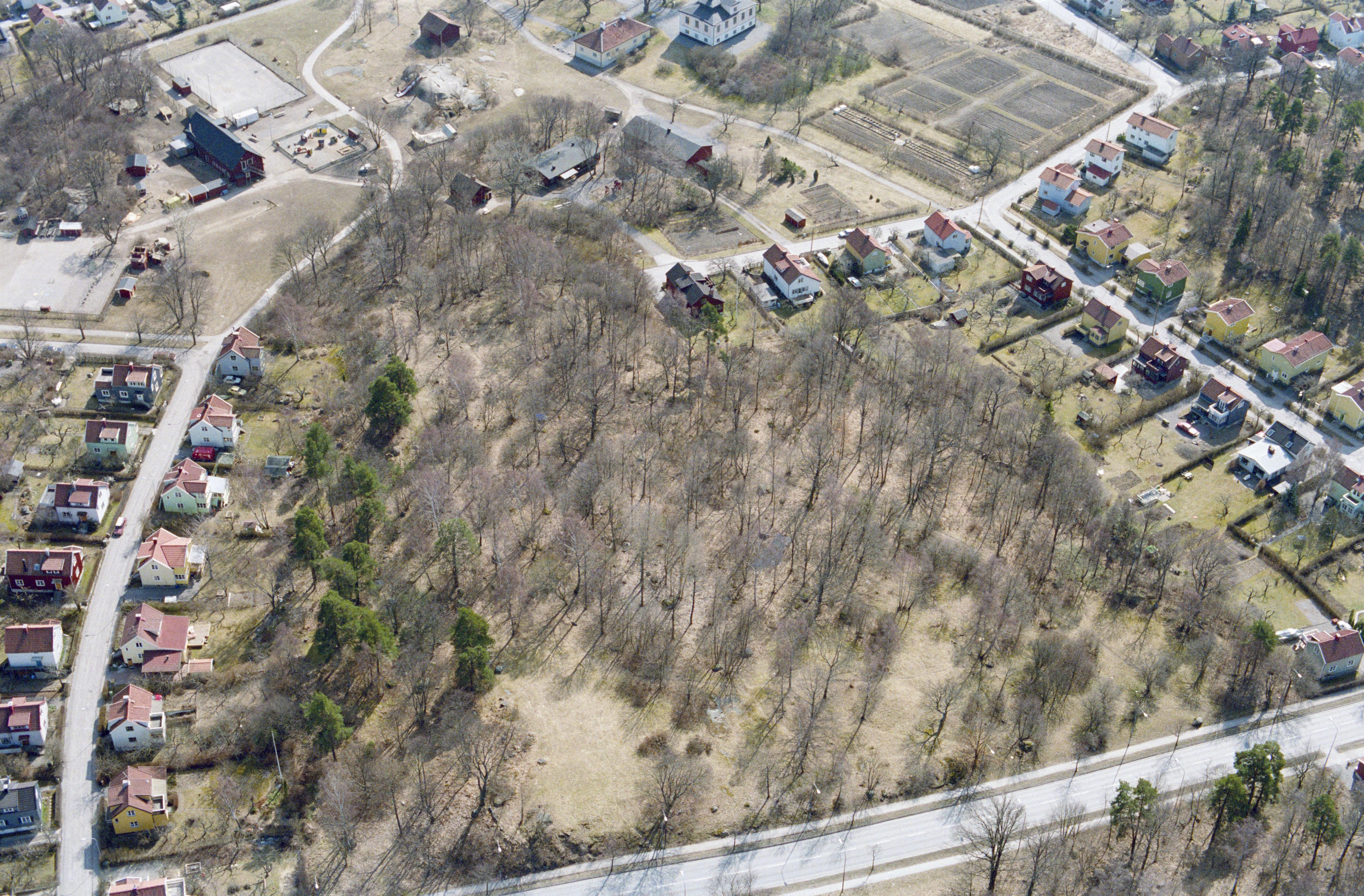 Beskrivning: Området Norra Ängby i stadsdelen Bromma i Stockholms Västerort. Gravfält Björklunds hage RAÄnr Bromma 62:1. I bildens övre del Stora Ängby herrgård i Norra Ängby. Bilden är tagen mot (väderstreck): SSO