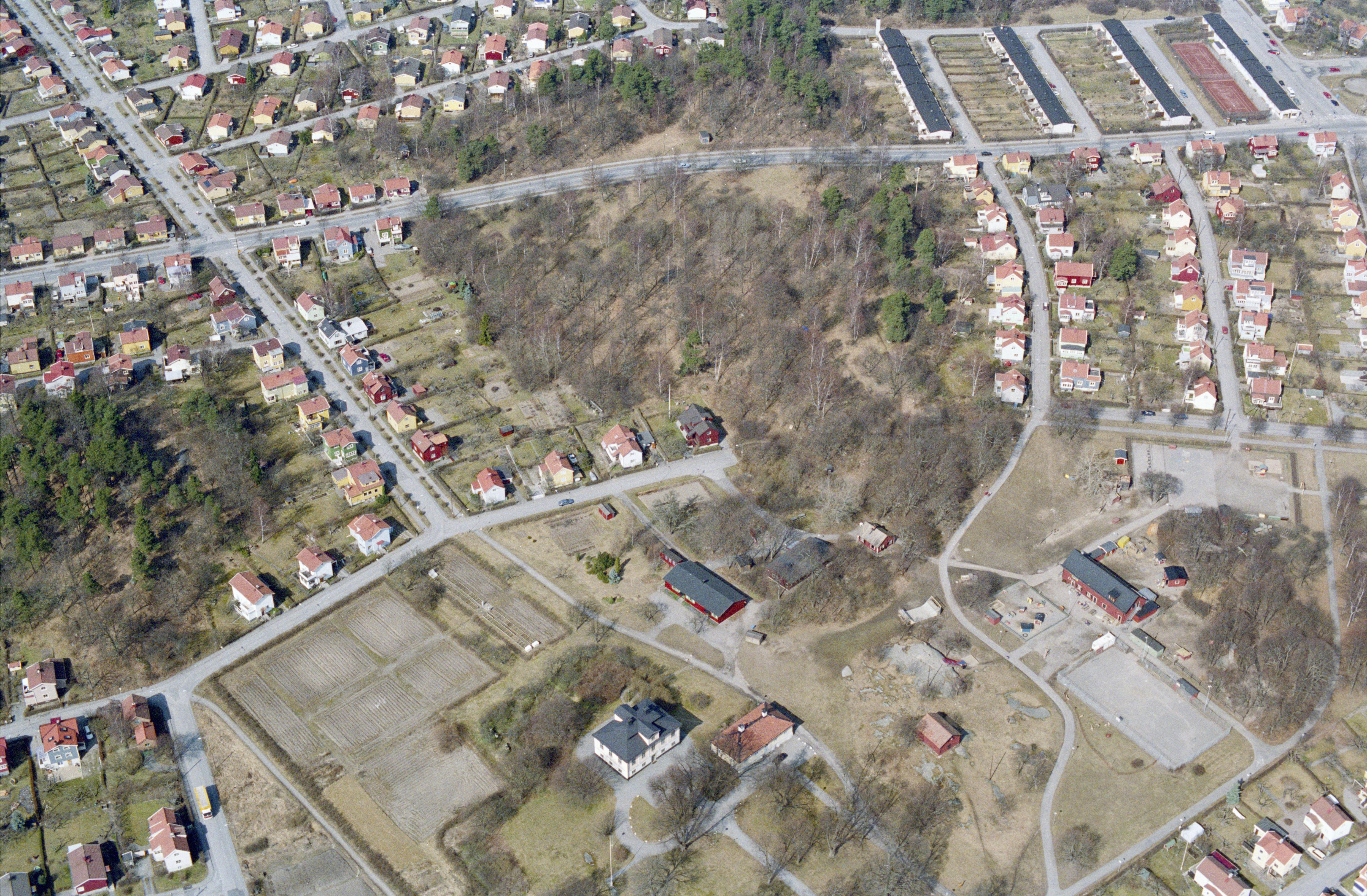 Beskrivning: Området Norra Ängby i stadsdelen Bromma i Stockholms Västerort. Gravfält Björklunds hage RAÄnr Bromma 62:1. I bildens nedre del Stora Ängby herrgård i Norra Ängby. Bilden är tagen mot (väderstreck): VNV