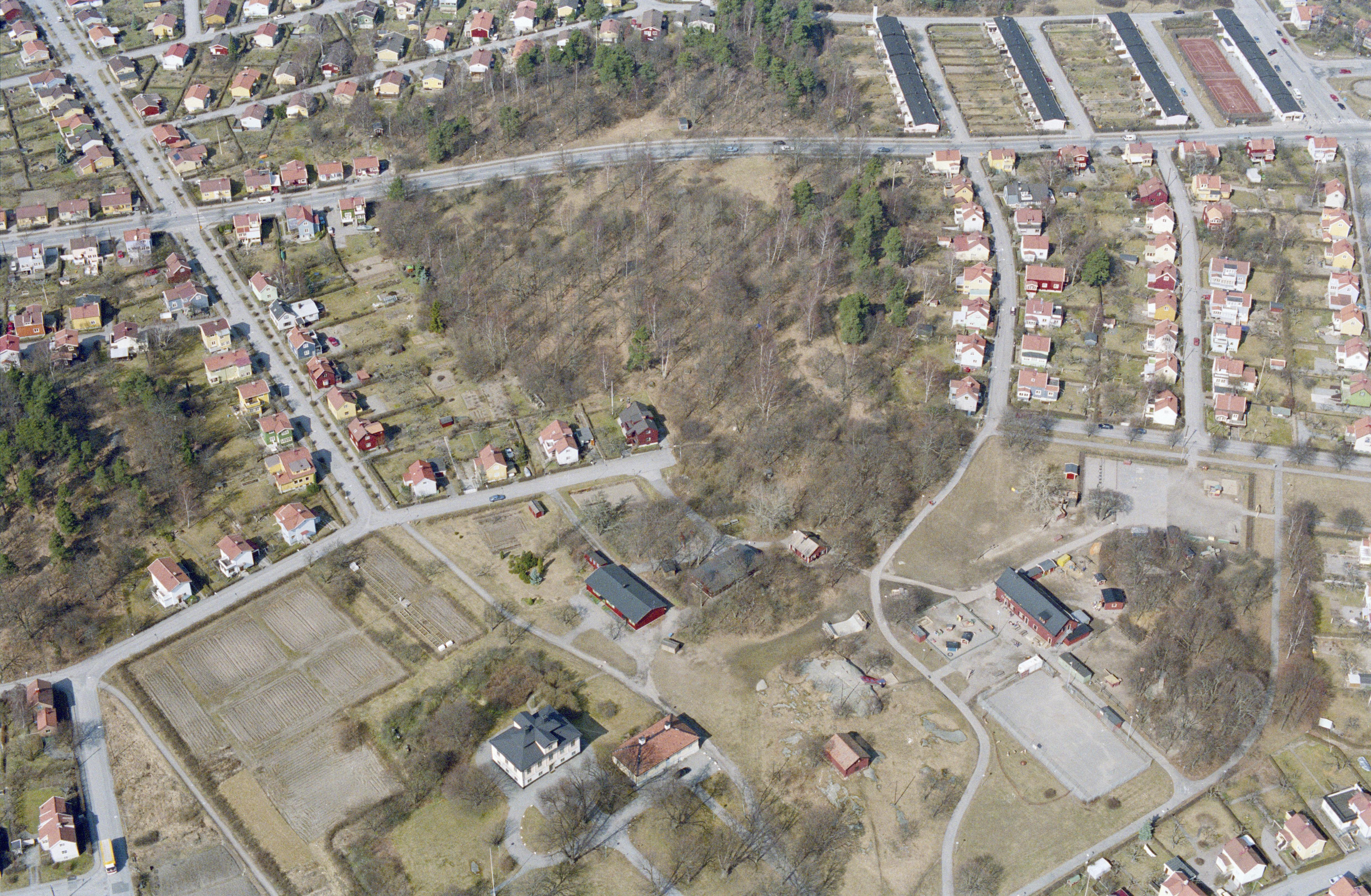 Beskrivning: Området Norra Ängby i stadsdelen Bromma i Stockholms Västerort. Gravfält Björklunds hage RAÄnr Bromma 62:1. I bildens nedre del Stora Ängby herrgård i Norra Ängby. Bilden är tagen mot (väderstreck): VNV