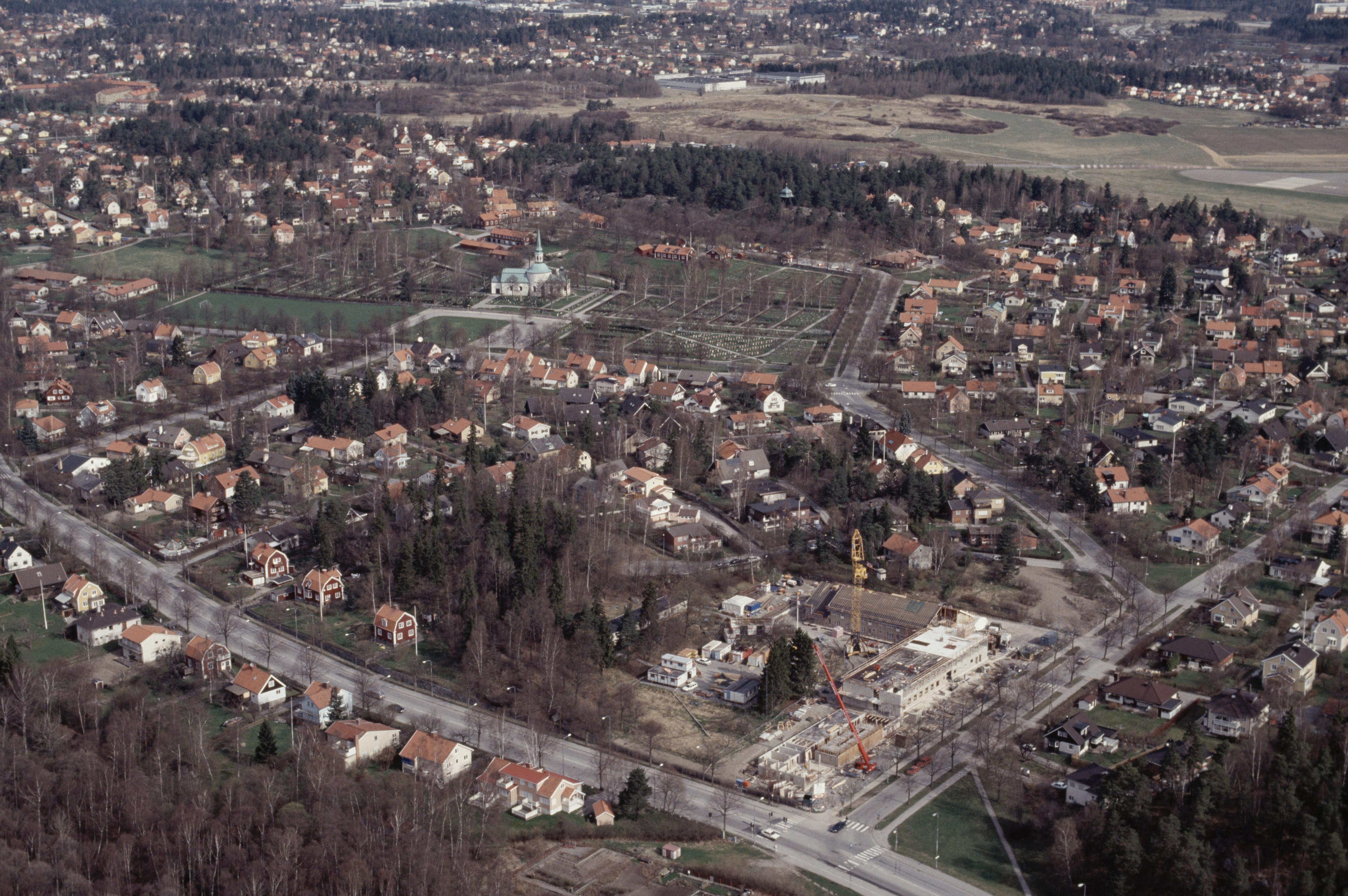 Beskrivning: Stadsdelen Bromma i Stockholms Västerort. Över bildens mitt Bromma kyrka med medeltida kyrkotomt RAÄnr Stockholm 992. Bilden är tagen mot (väderstreck): NV